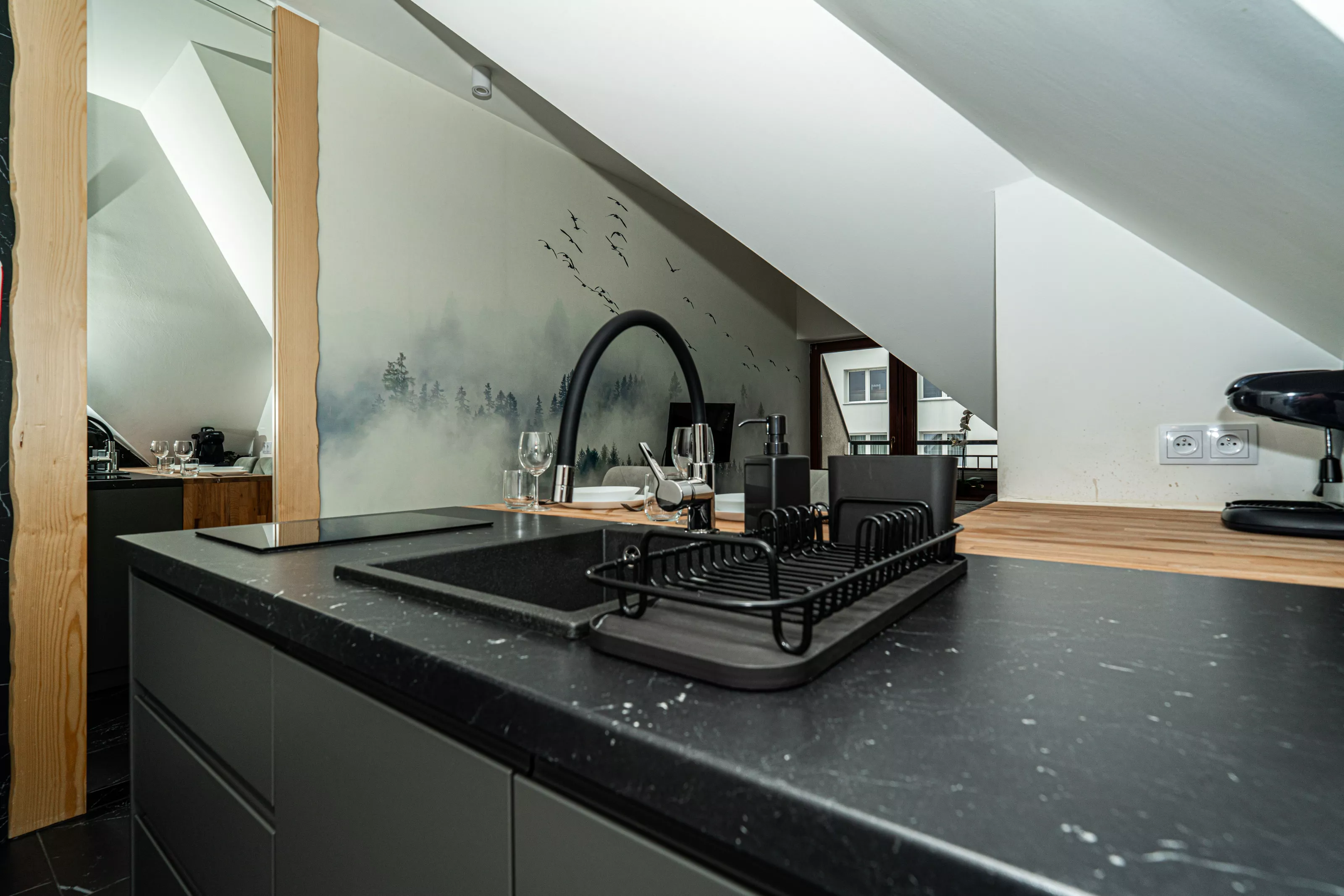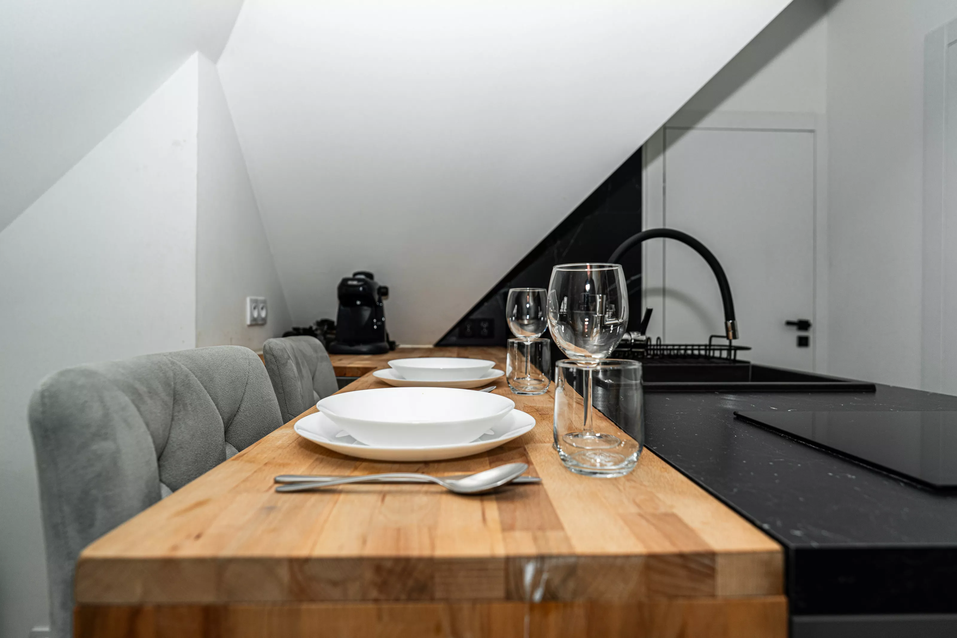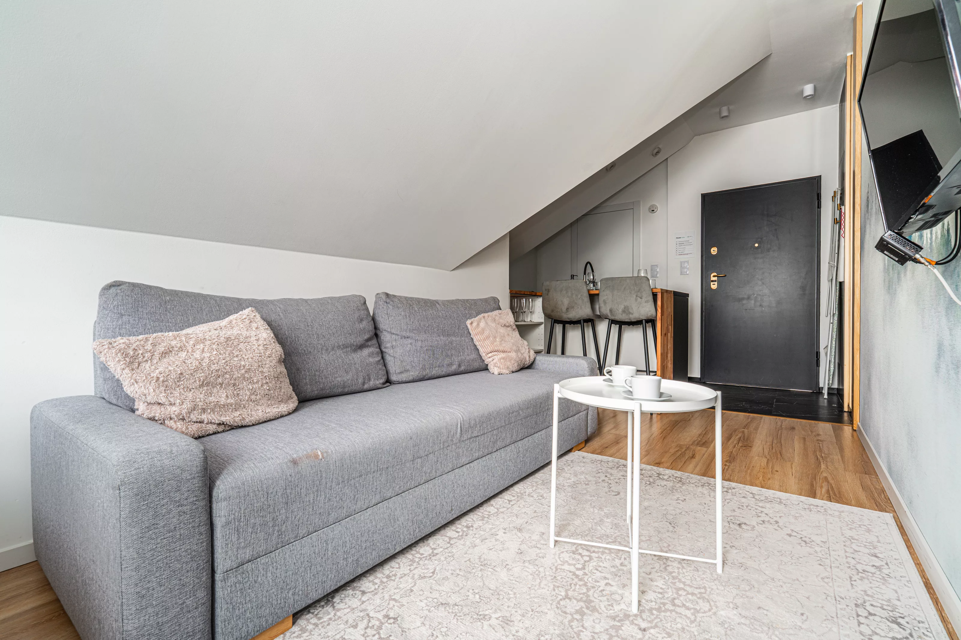 Apartament 4 osobowy blisko dworca PKP PKS. Sypialnia z jednym łóżkiem dwuosobowym oraz rozkładana sofa w salonie. Wygodna kuchnia z małym salonem.