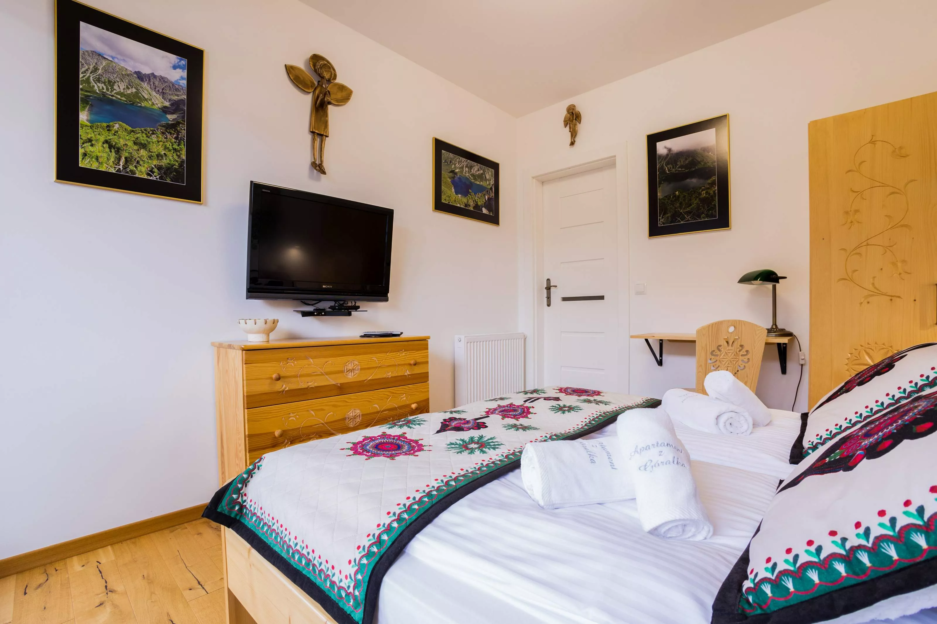 Widok na Giewont. Apartament usytuowany w idealnym miejscu. Niedaleko centrum, 5 min spacerkiem do Krupówek. Łatwość nawiązania kontaktu z właścicielami. Odbiór kluczy i meldunek możliwy nawet o 2 w nocy.