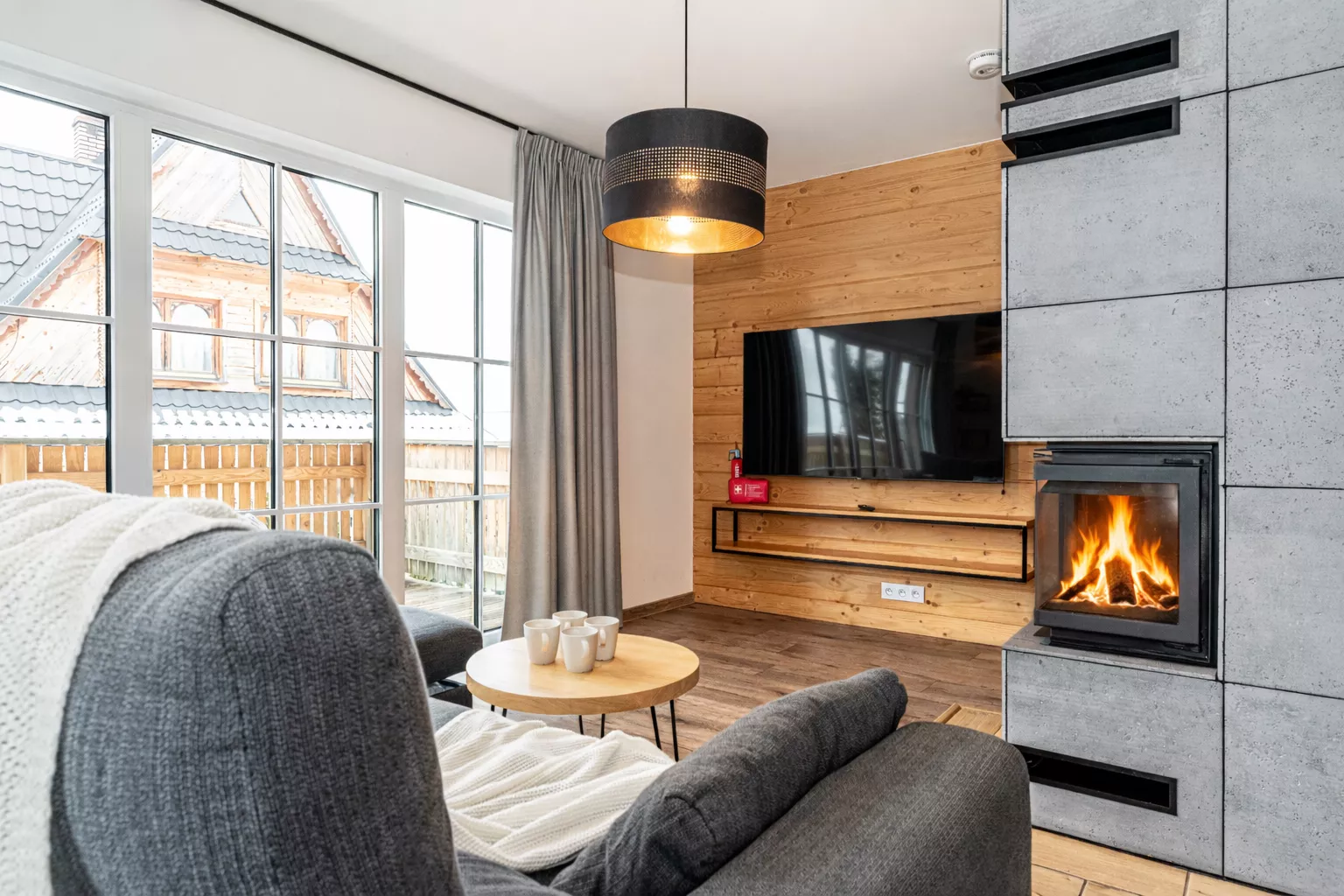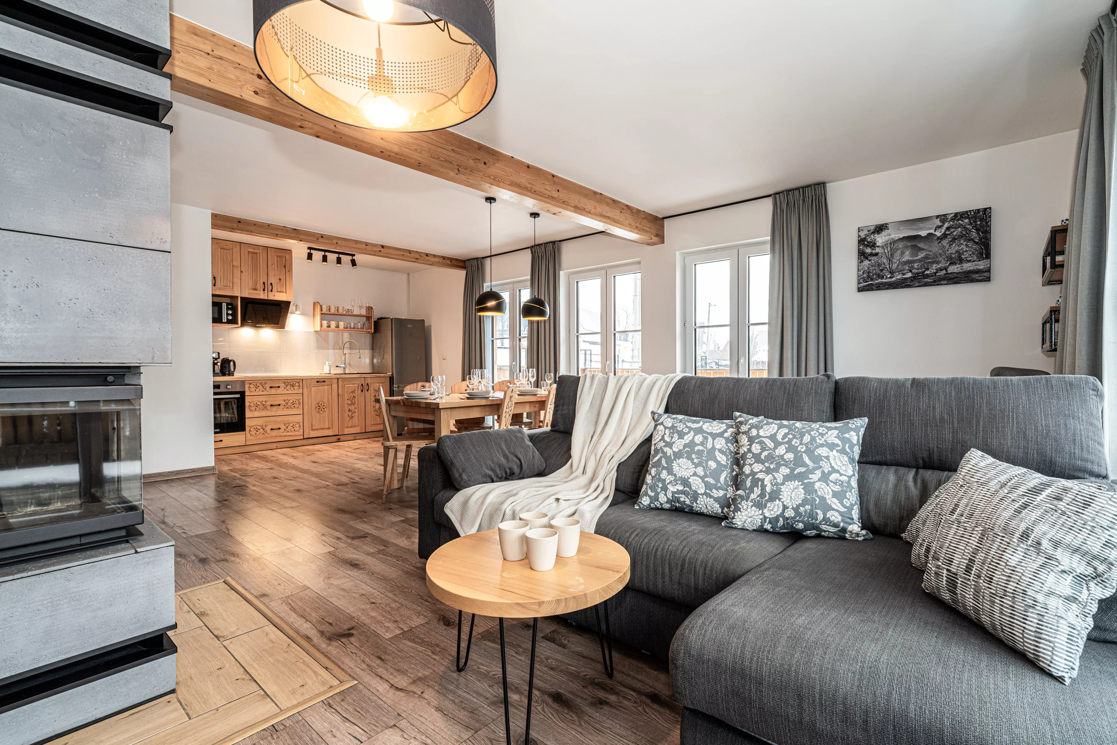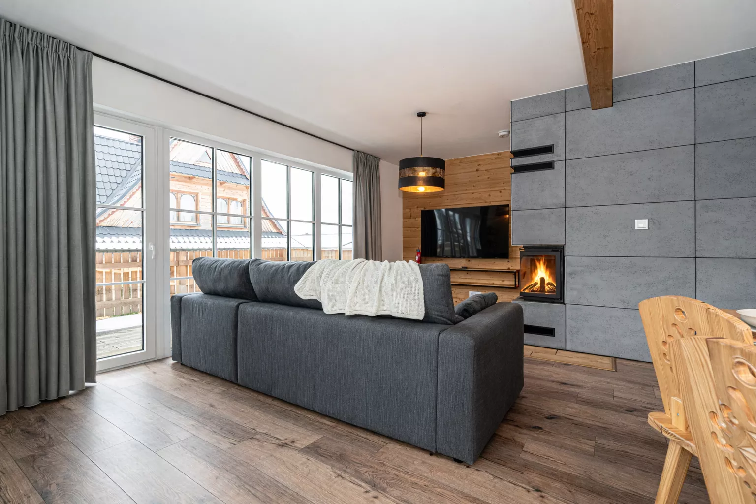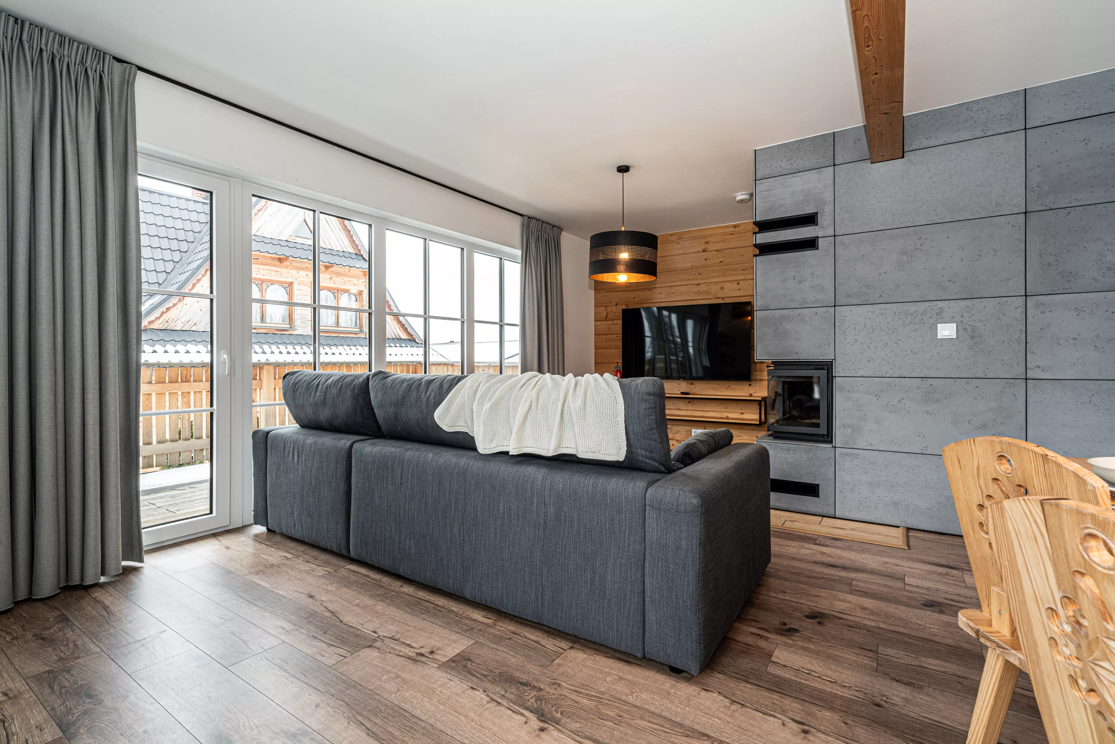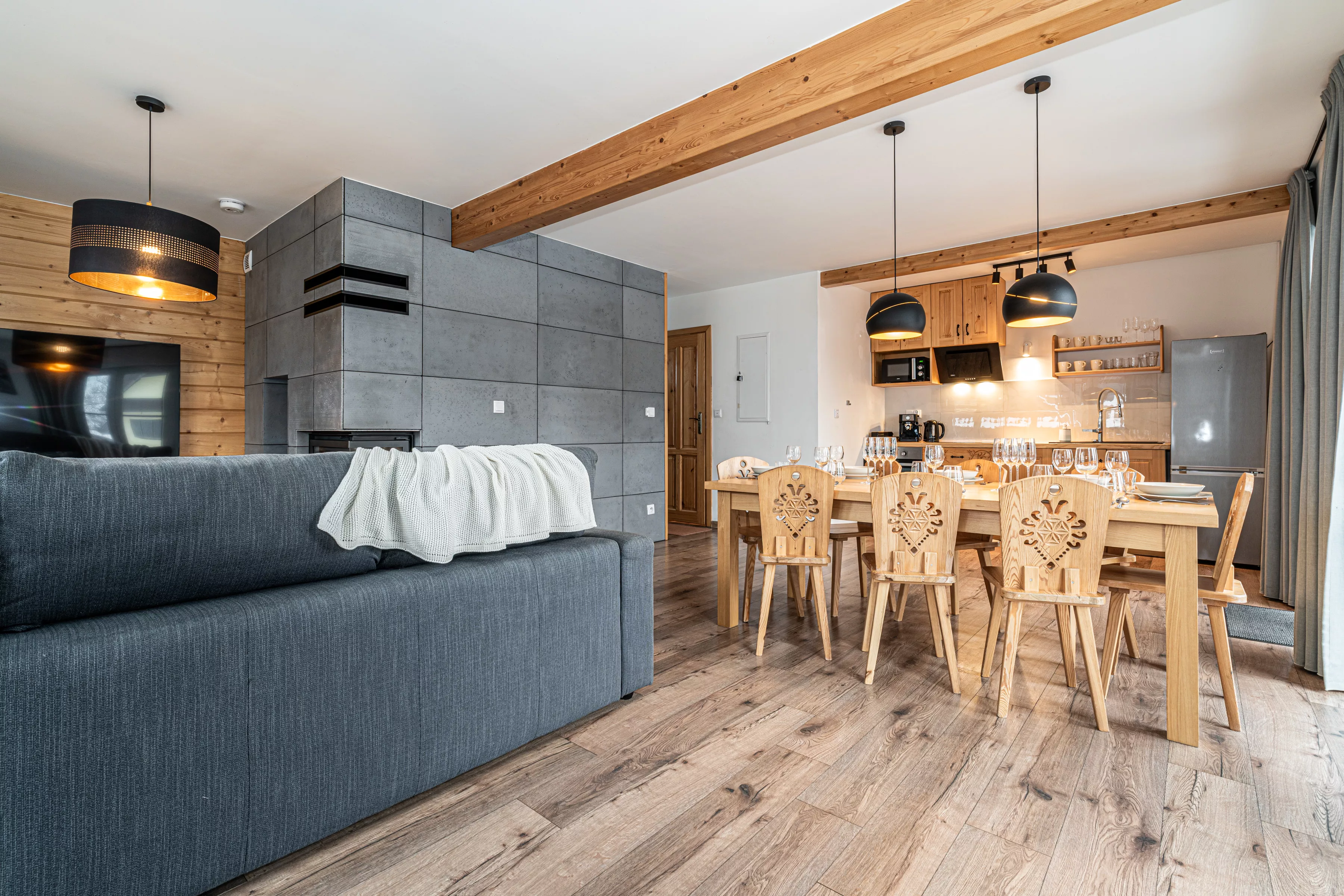 Wnętrze domku łączy nowoczesne rozwiązania z przytulnym, górskim stylem. Naturalne drewno i kamień nadają mu ciepły charakter, a kominek w salonie tworzy wyjątkową atmosferę sprzyjającą relaksowi po dniu pełnym wrażeń. Komfortowa strefa wypoczynkowa zachęca do wspólnego spędzania czasu, rozmów, czytania lub odpoczynku przy ogniu.