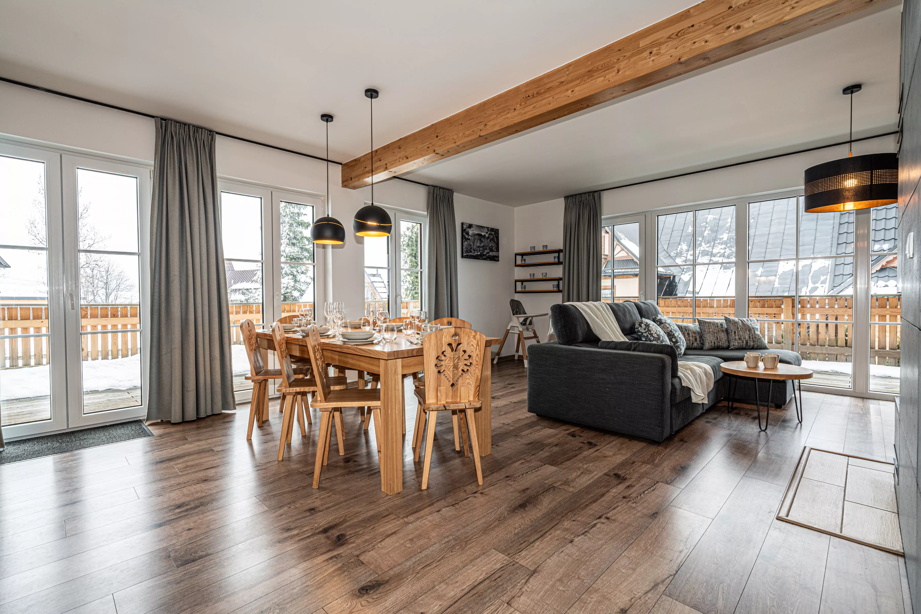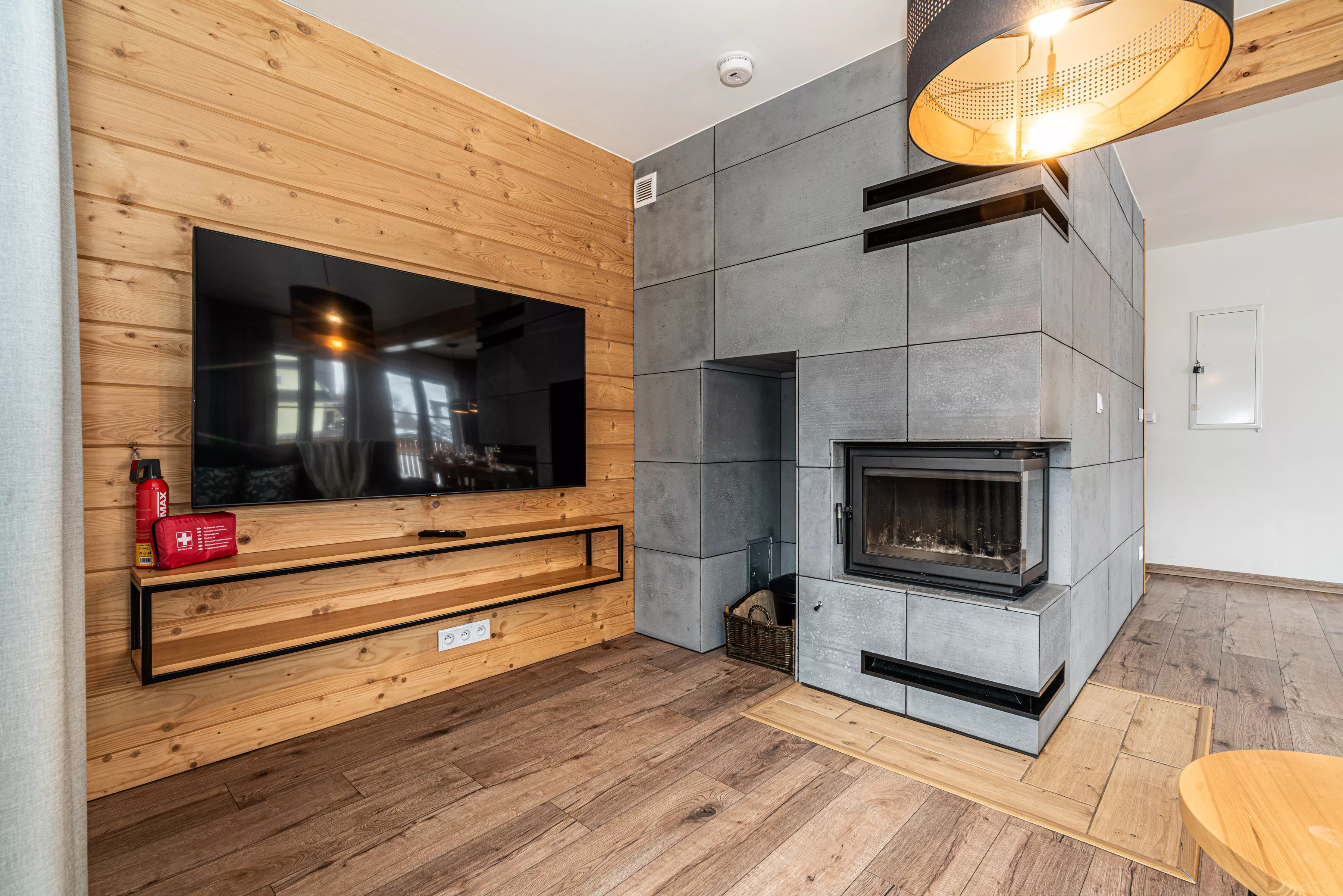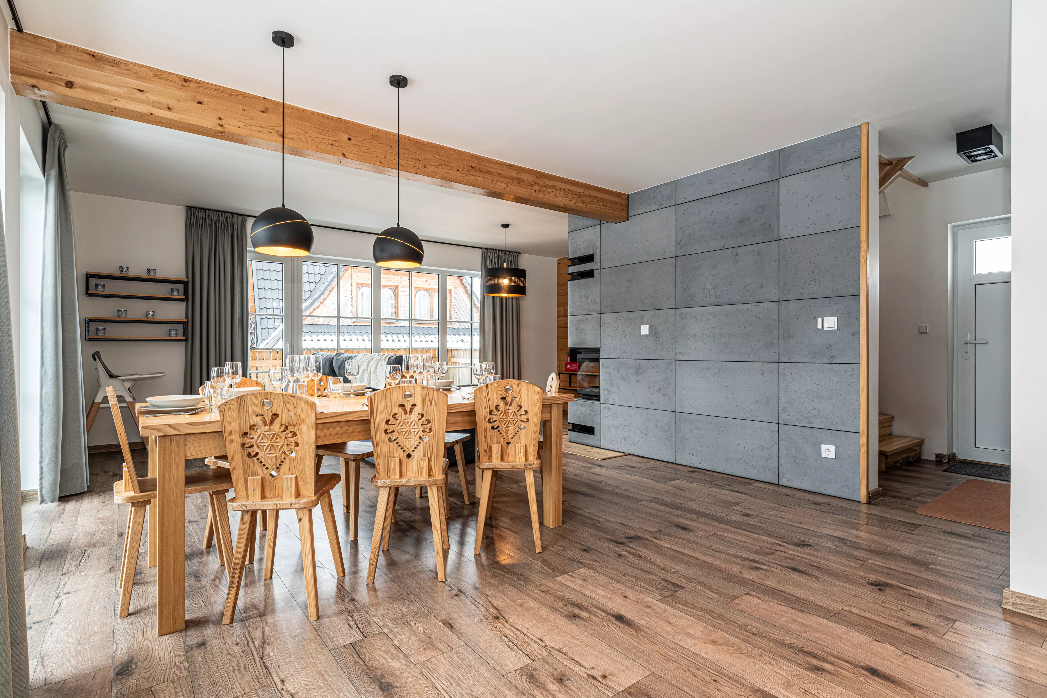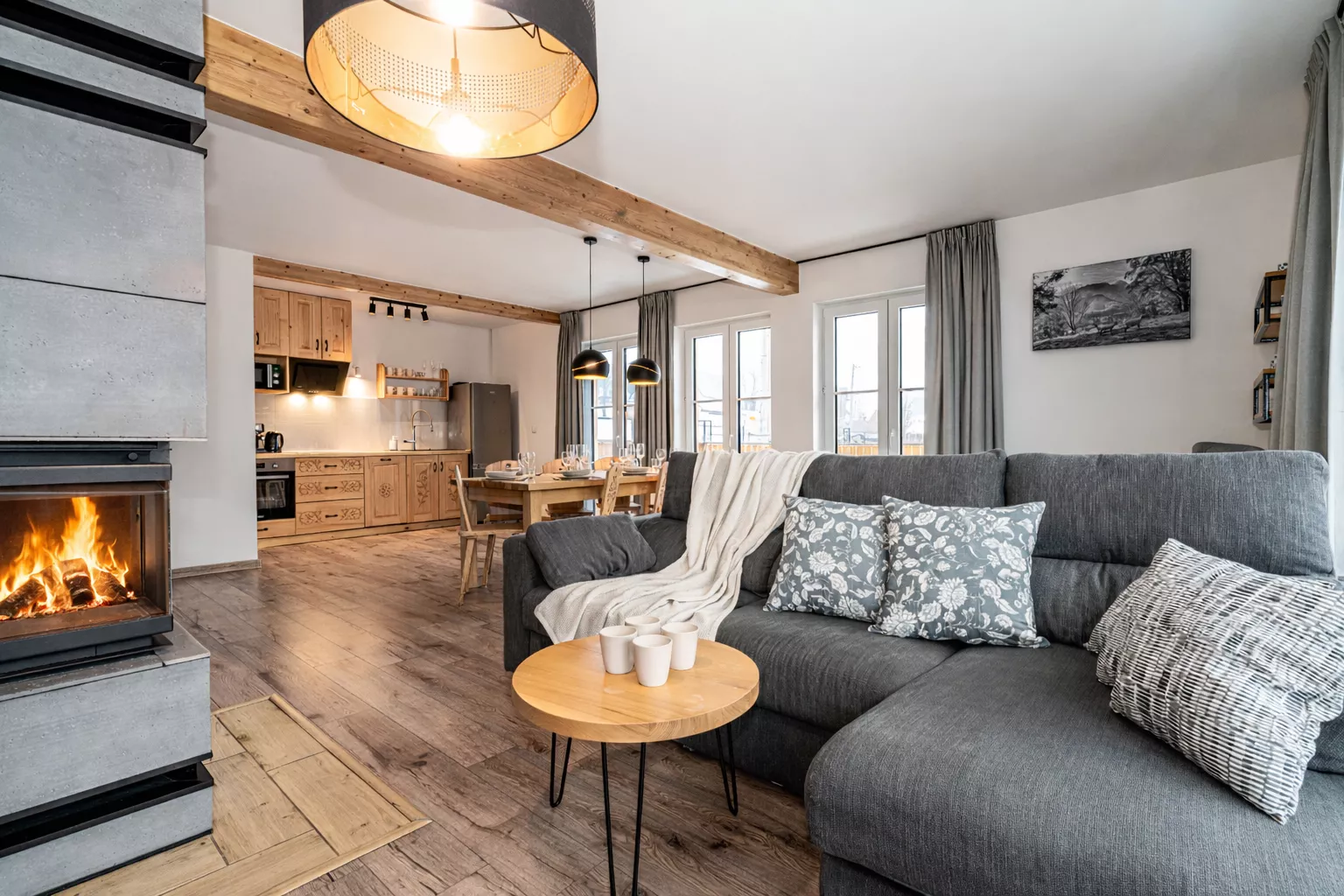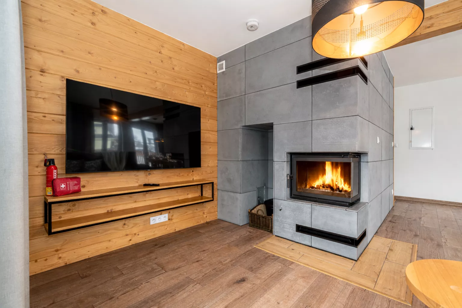 Wnętrze domku łączy nowoczesne rozwiązania z przytulnym, górskim stylem. Naturalne drewno i kamień nadają mu ciepły charakter, a kominek w salonie tworzy wyjątkową atmosferę sprzyjającą relaksowi po dniu pełnym wrażeń. Komfortowa strefa wypoczynkowa zachęca do wspólnego spędzania czasu, rozmów, czytania lub odpoczynku przy ogniu.