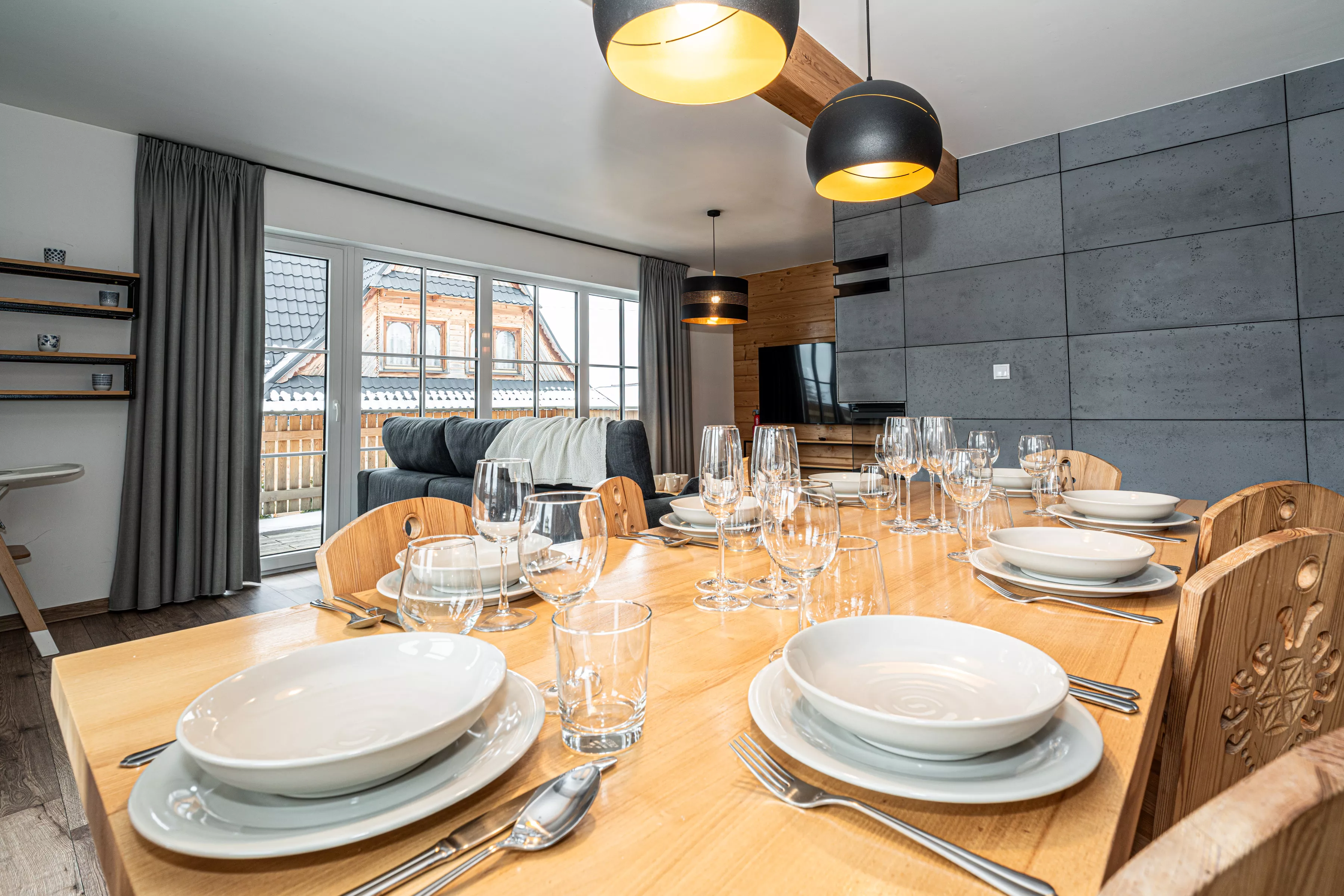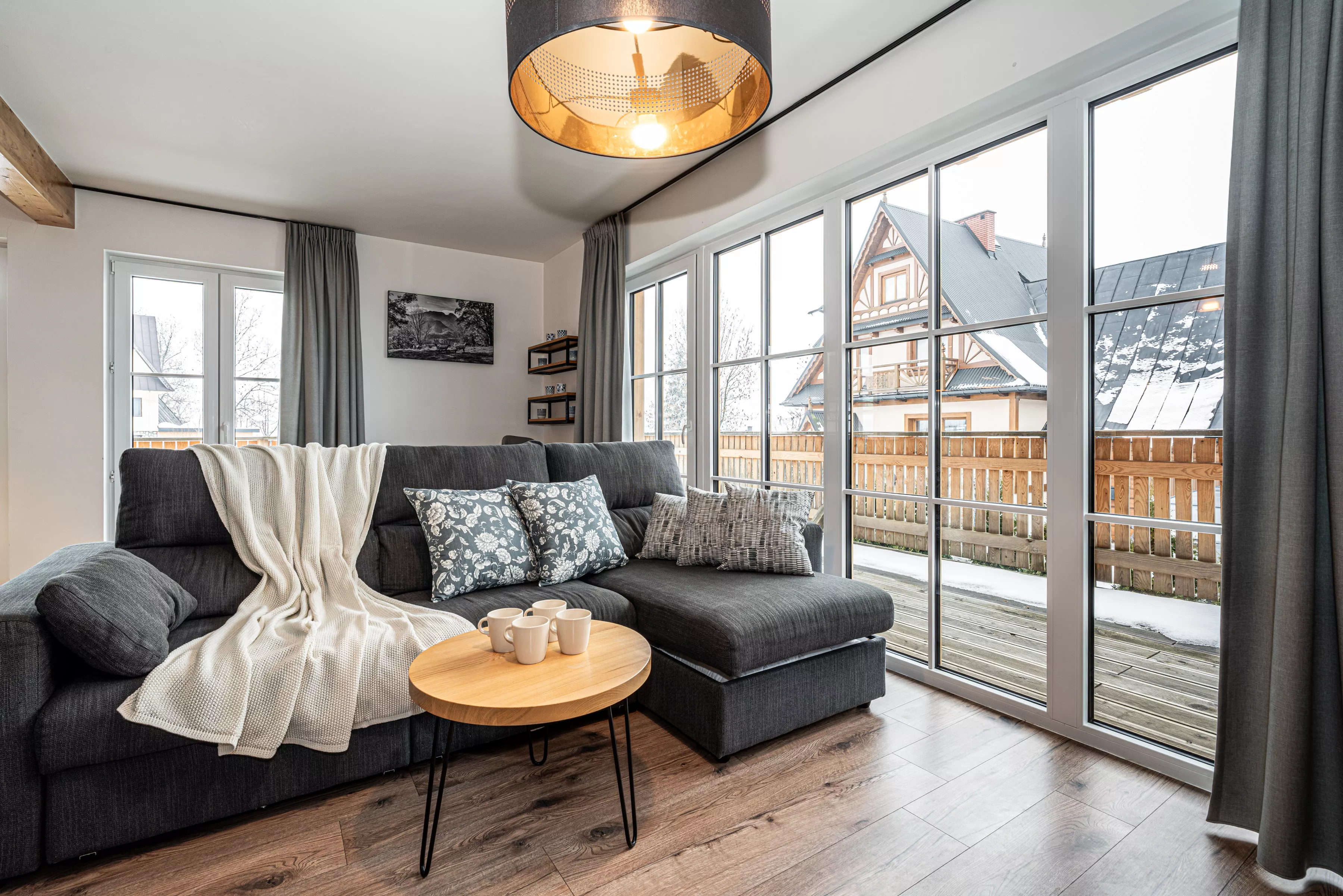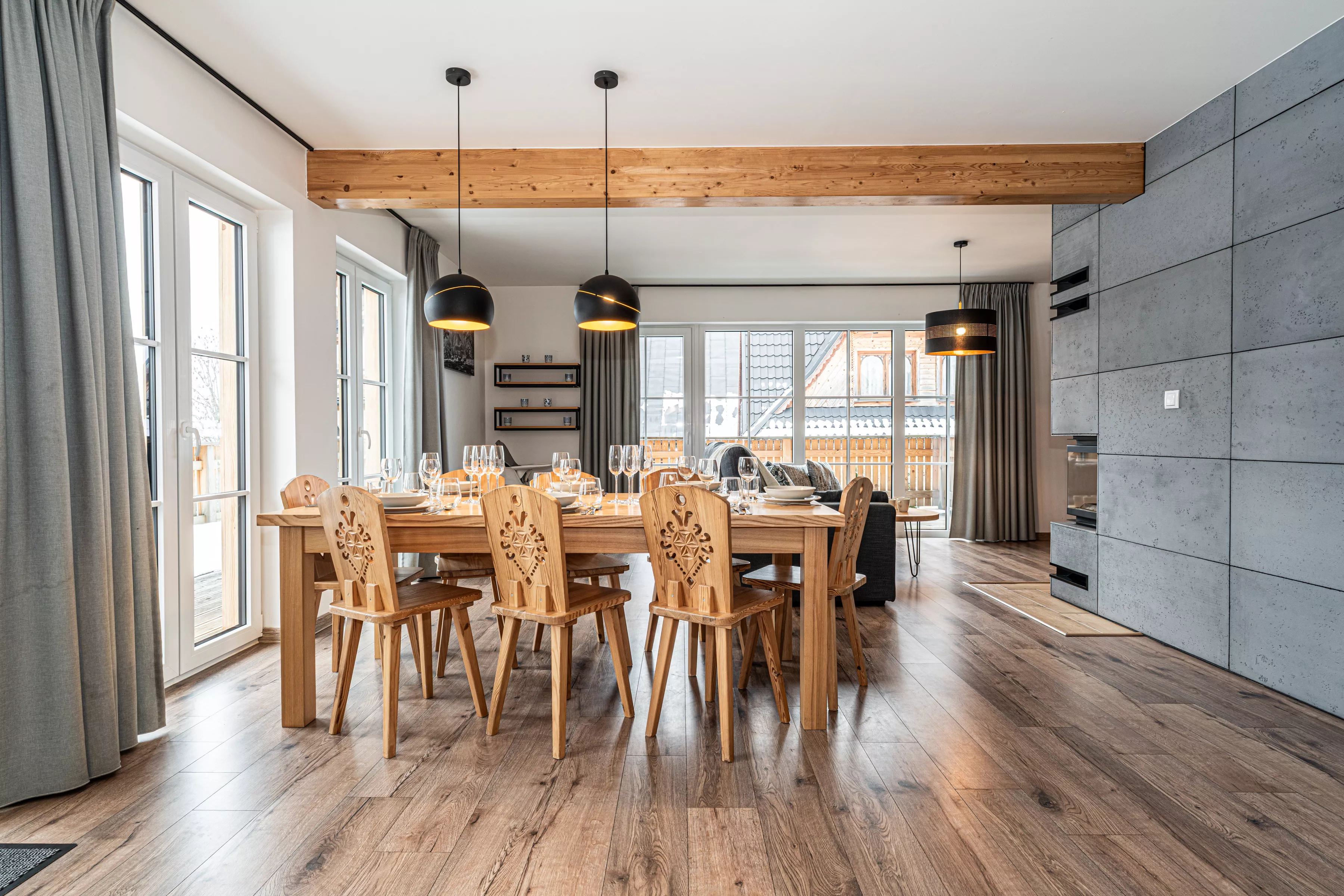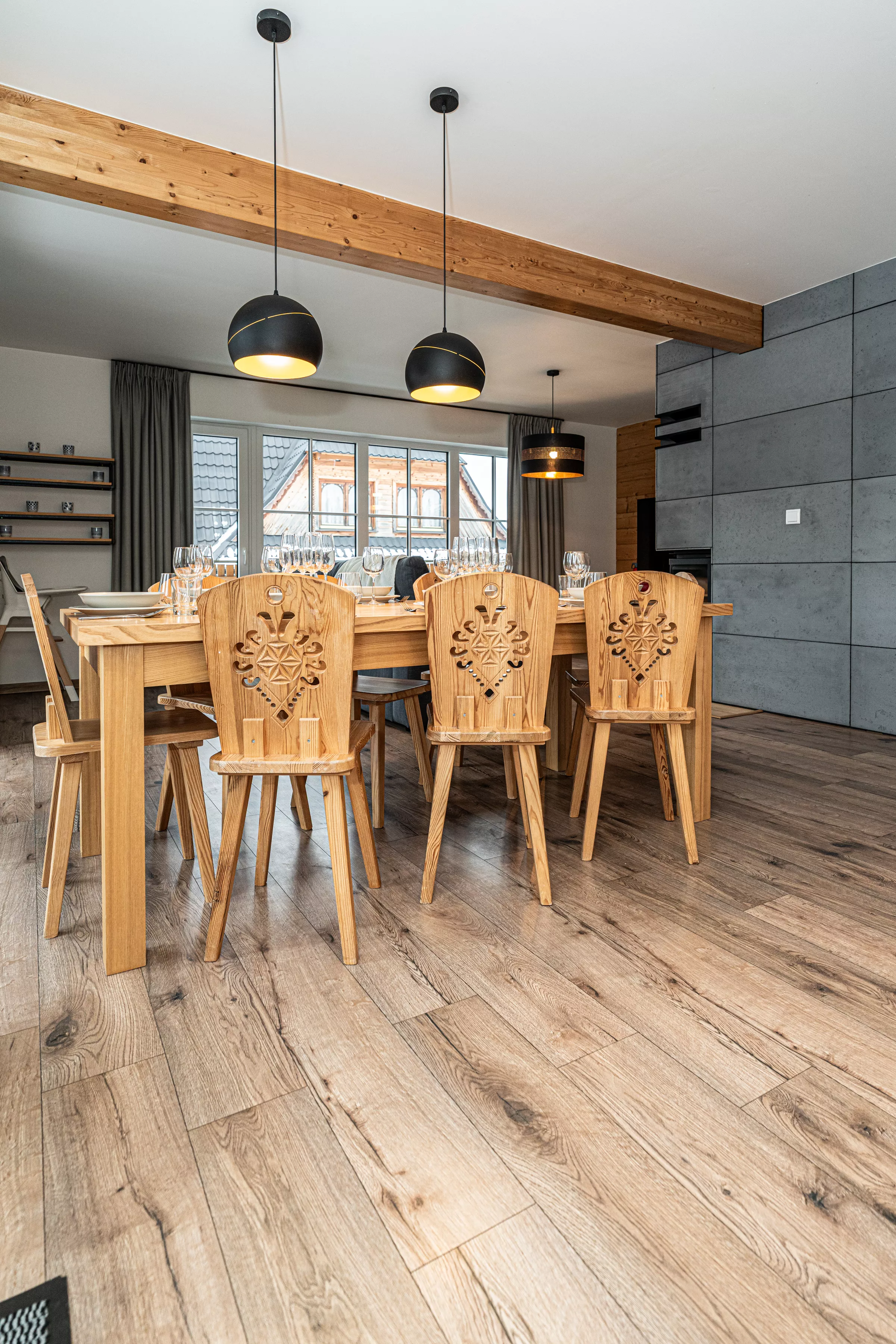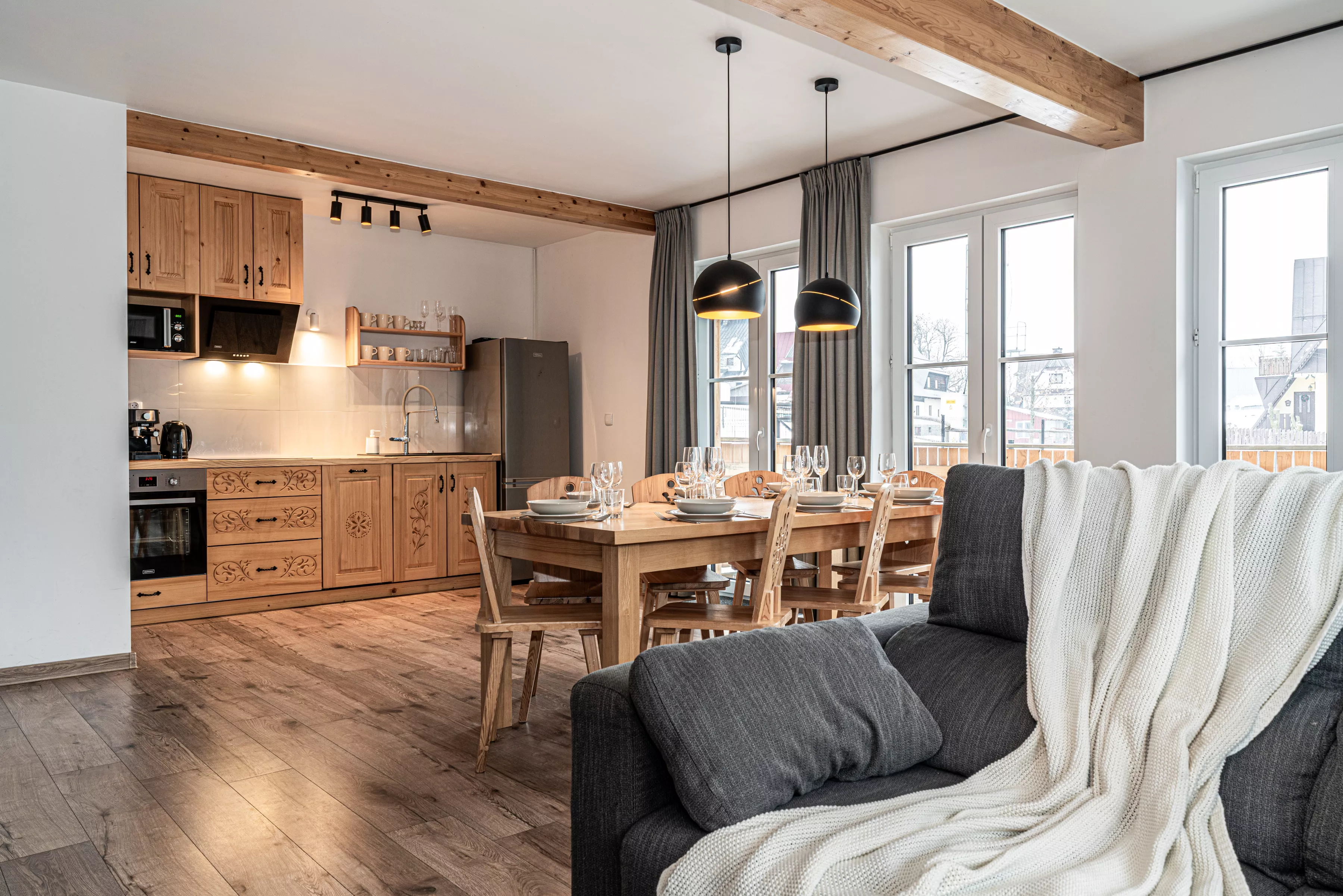 Wnętrze domku łączy nowoczesne rozwiązania z przytulnym, górskim stylem. Naturalne drewno i kamień nadają mu ciepły charakter, a kominek w salonie tworzy wyjątkową atmosferę sprzyjającą relaksowi po dniu pełnym wrażeń. Komfortowa strefa wypoczynkowa zachęca do wspólnego spędzania czasu, rozmów, czytania lub odpoczynku przy ogniu.