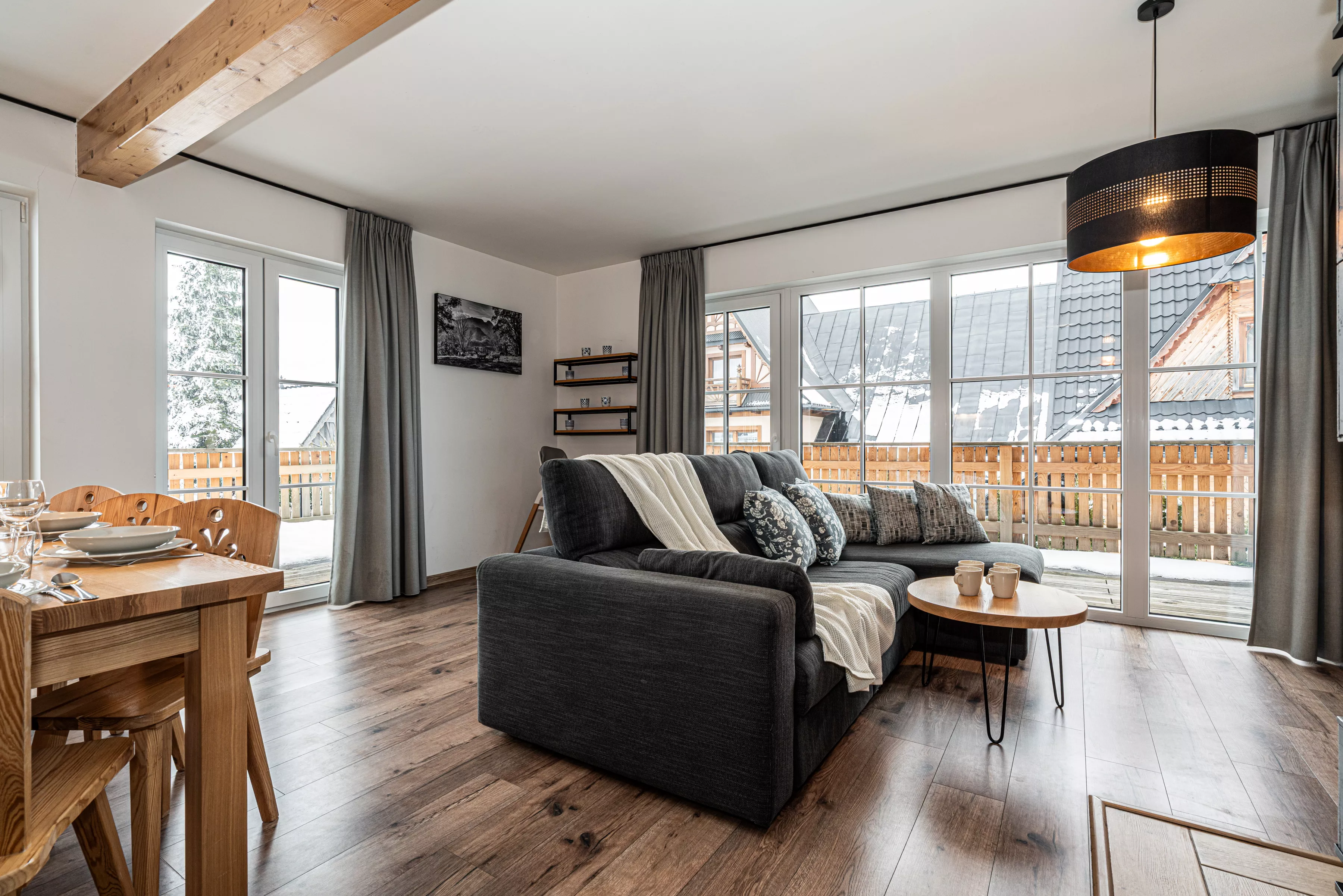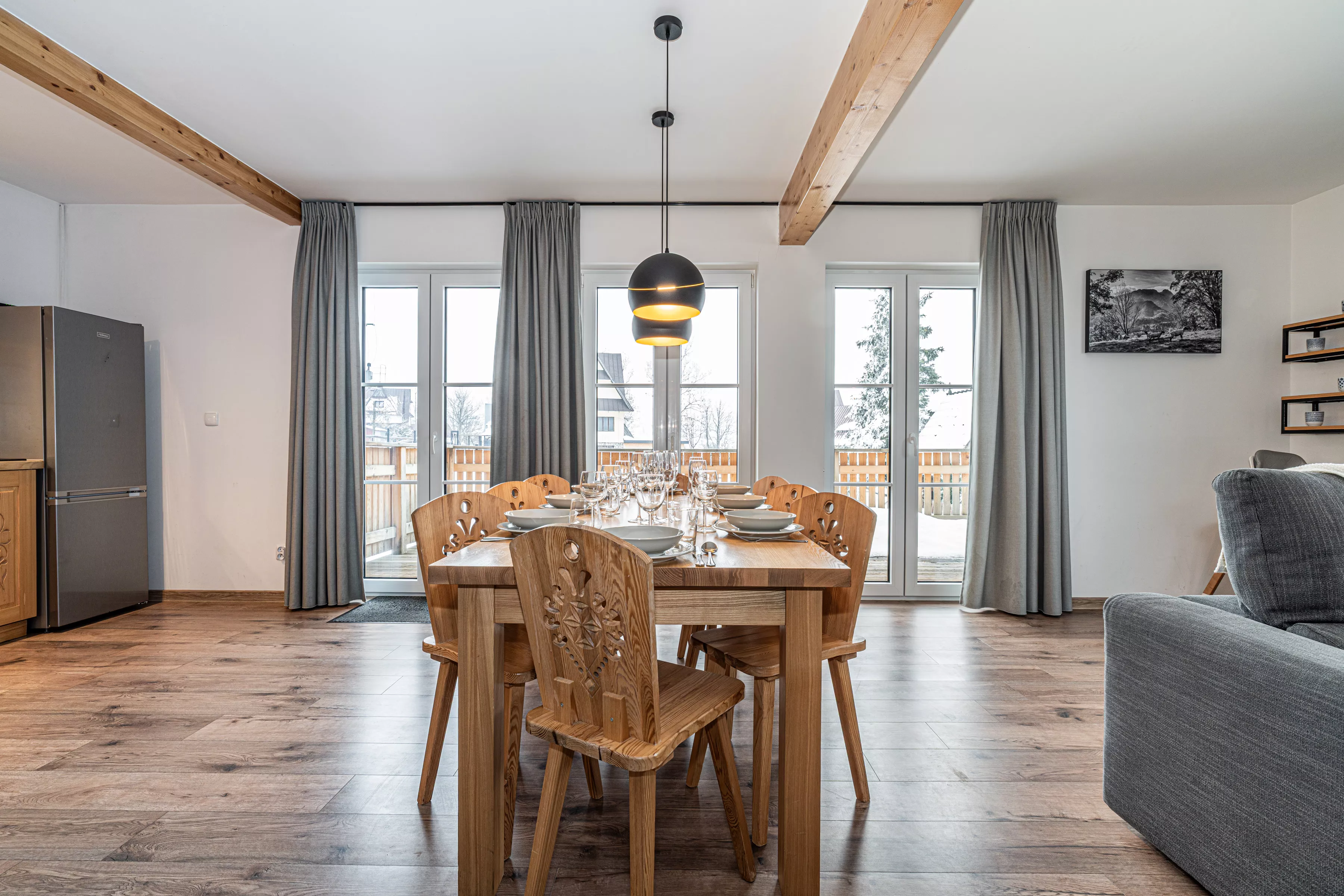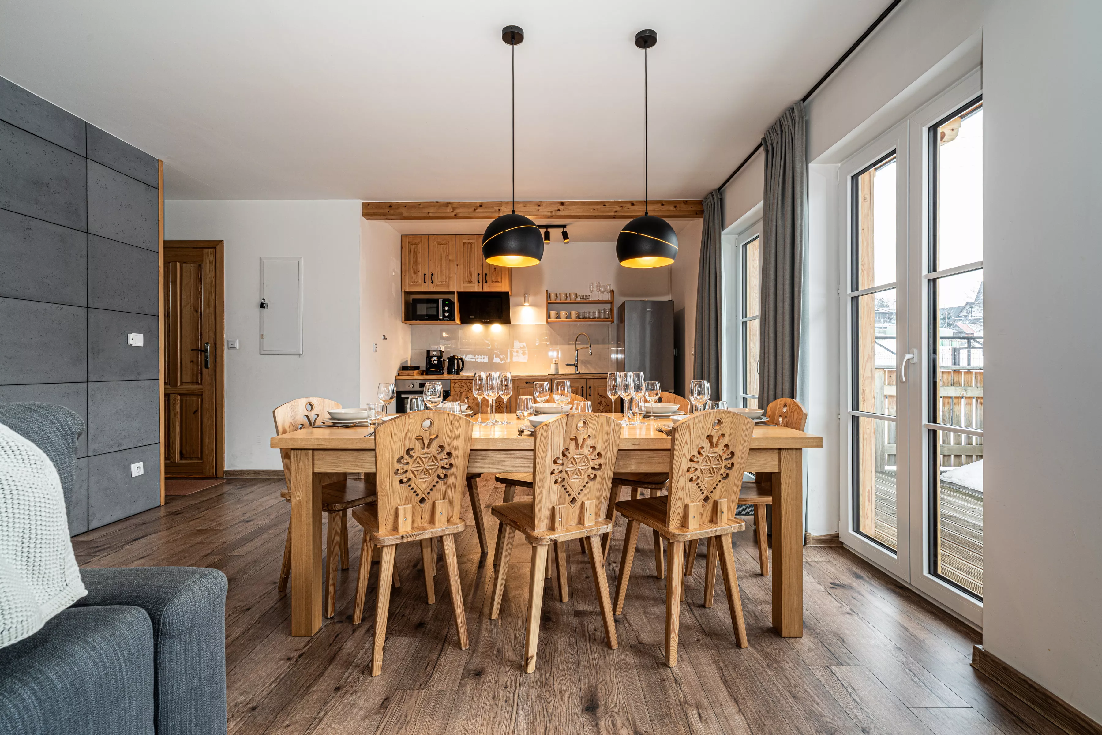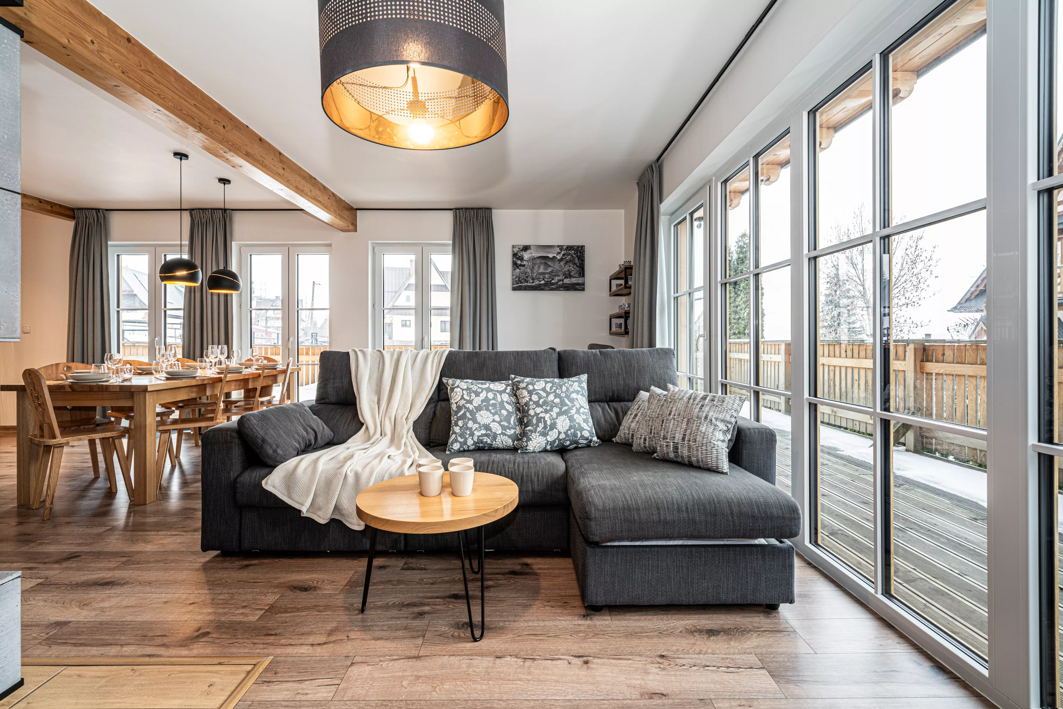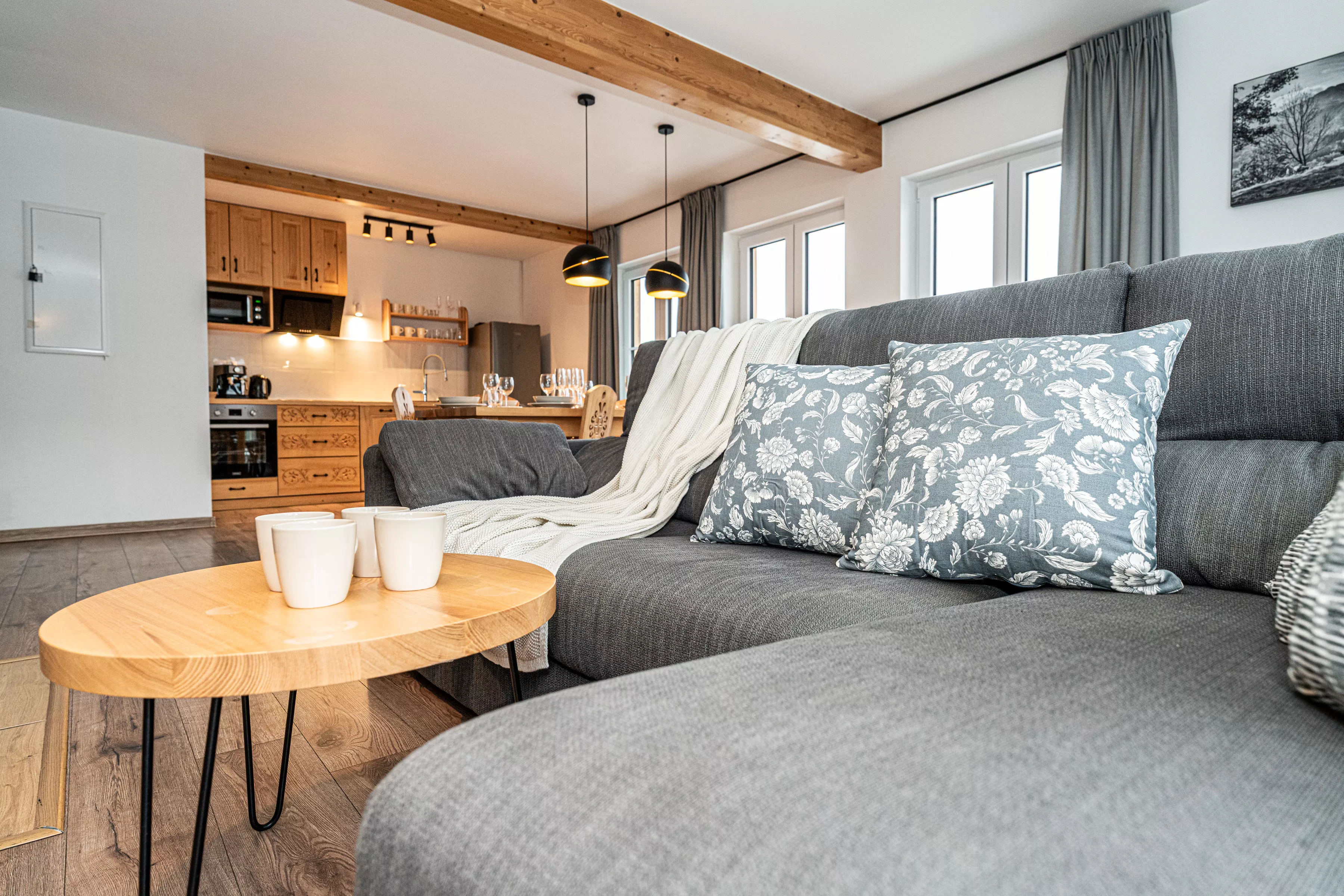 Wnętrze domku łączy nowoczesne rozwiązania z przytulnym, górskim stylem. Naturalne drewno i kamień nadają mu ciepły charakter, a kominek w salonie tworzy wyjątkową atmosferę sprzyjającą relaksowi po dniu pełnym wrażeń. Komfortowa strefa wypoczynkowa zachęca do wspólnego spędzania czasu, rozmów, czytania lub odpoczynku przy ogniu.