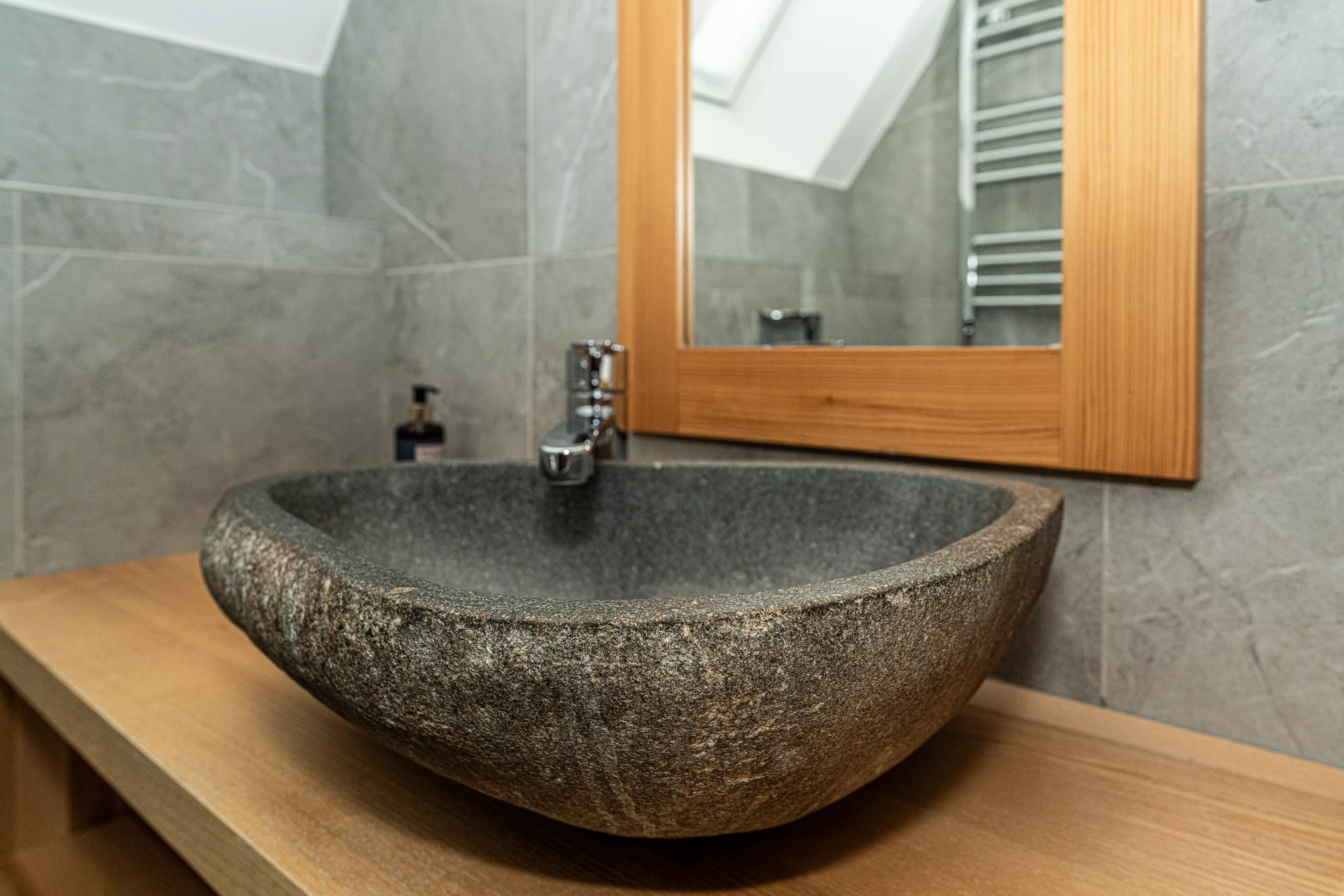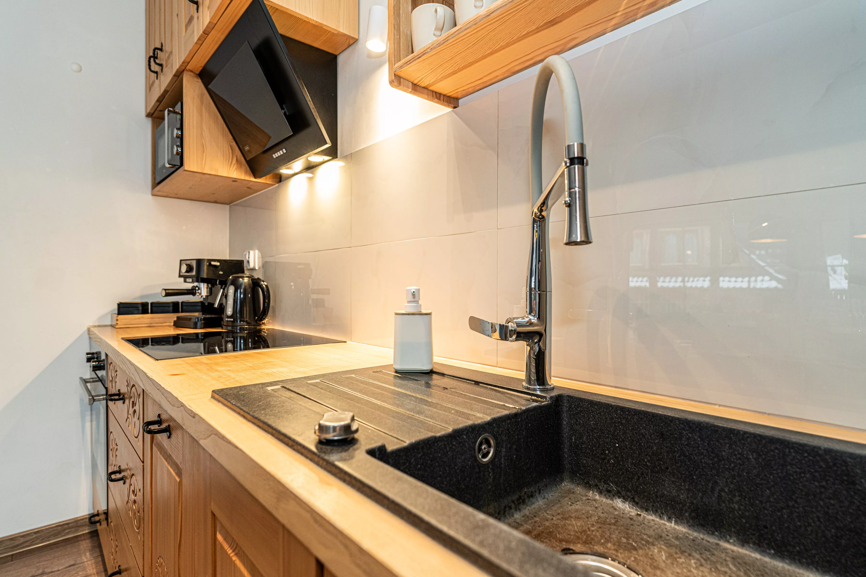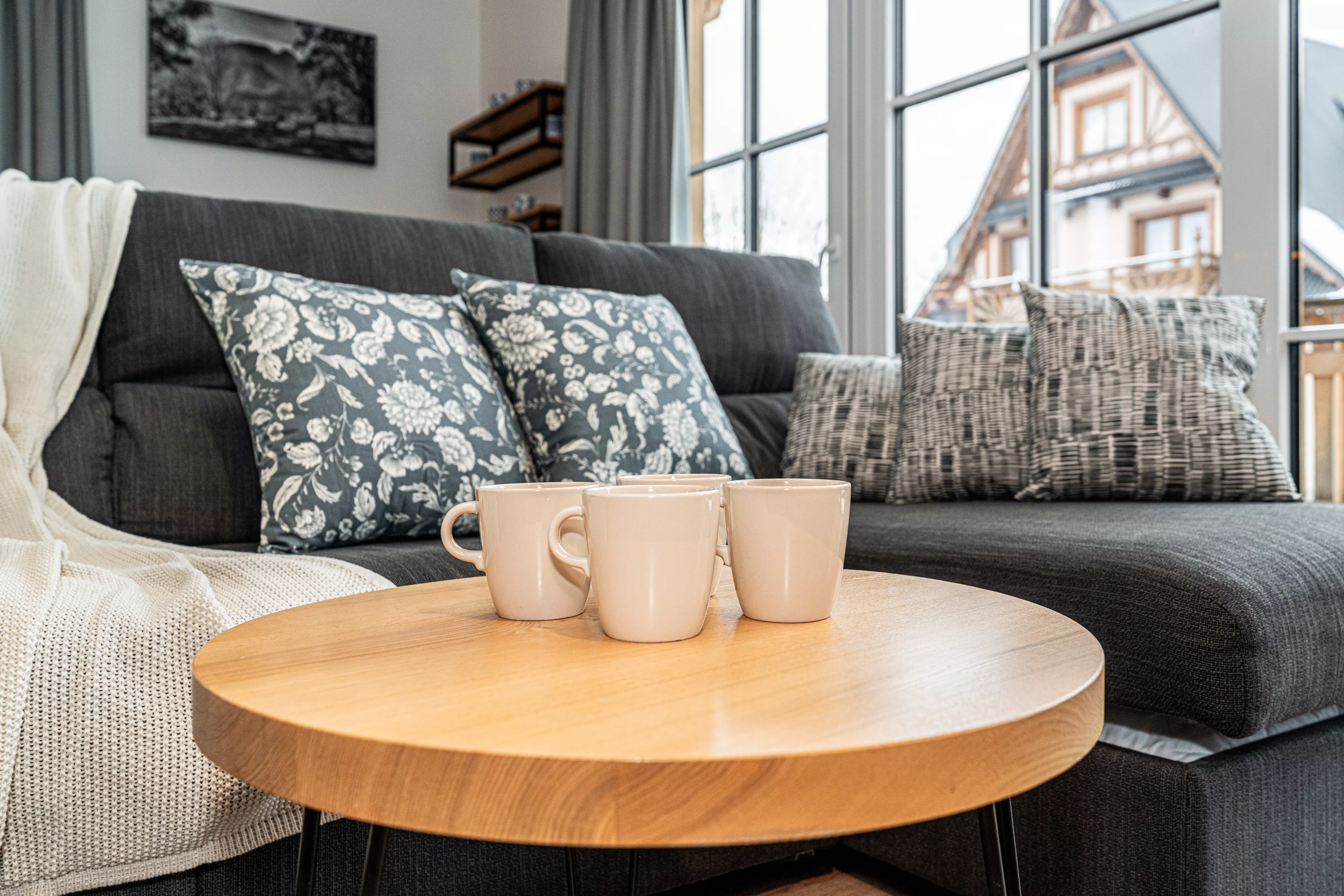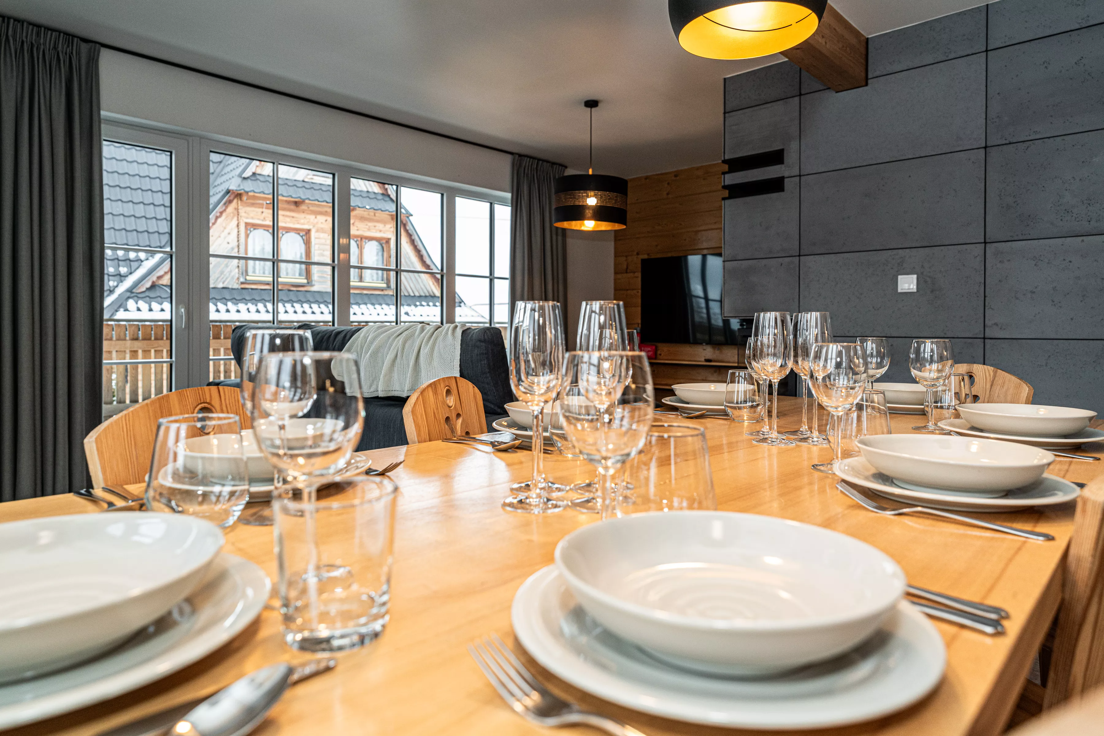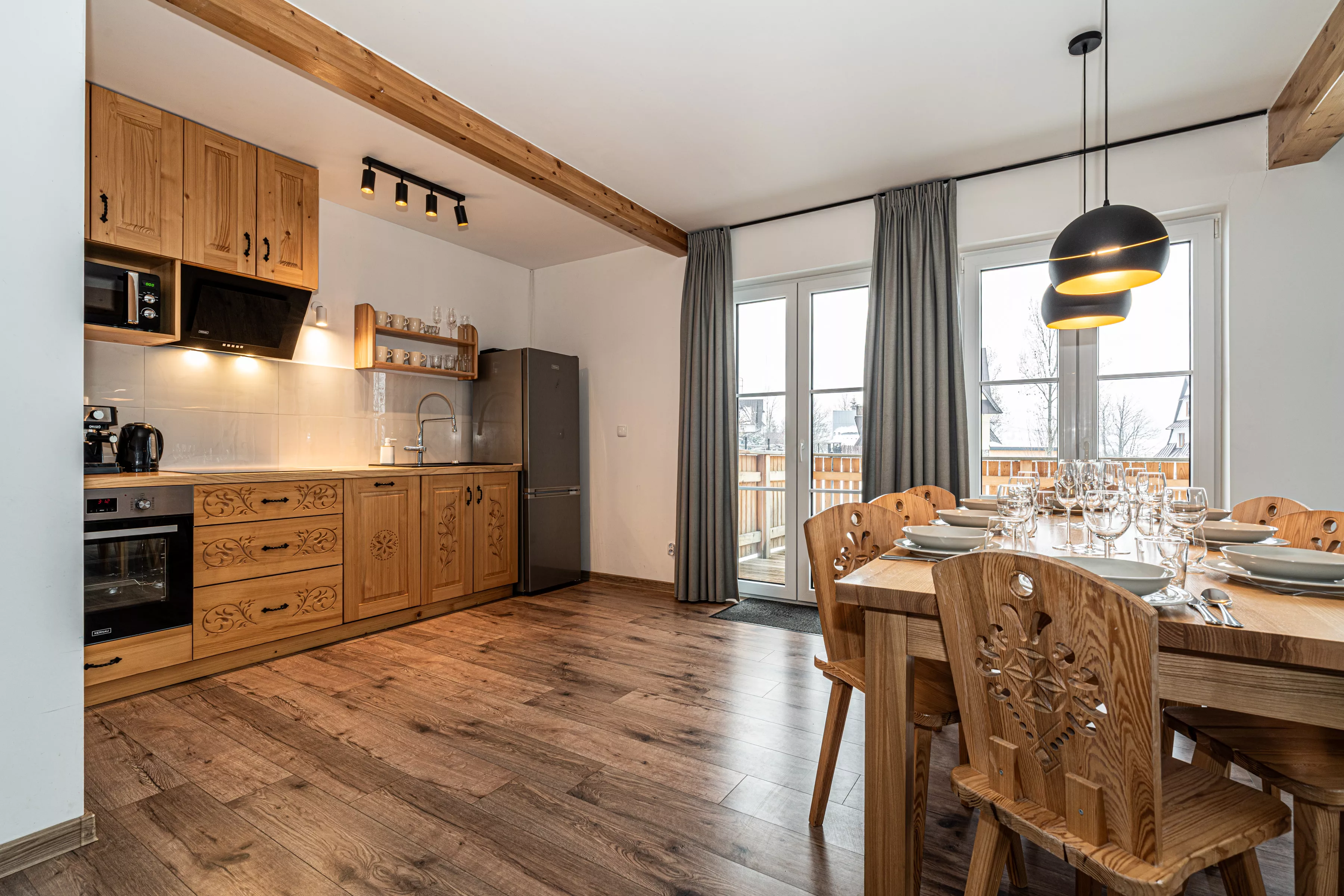 Wnętrze domku łączy nowoczesne rozwiązania z przytulnym, górskim stylem. Naturalne drewno i kamień nadają mu ciepły charakter, a kominek w salonie tworzy wyjątkową atmosferę sprzyjającą relaksowi po dniu pełnym wrażeń. Komfortowa strefa wypoczynkowa zachęca do wspólnego spędzania czasu, rozmów, czytania lub odpoczynku przy ogniu.