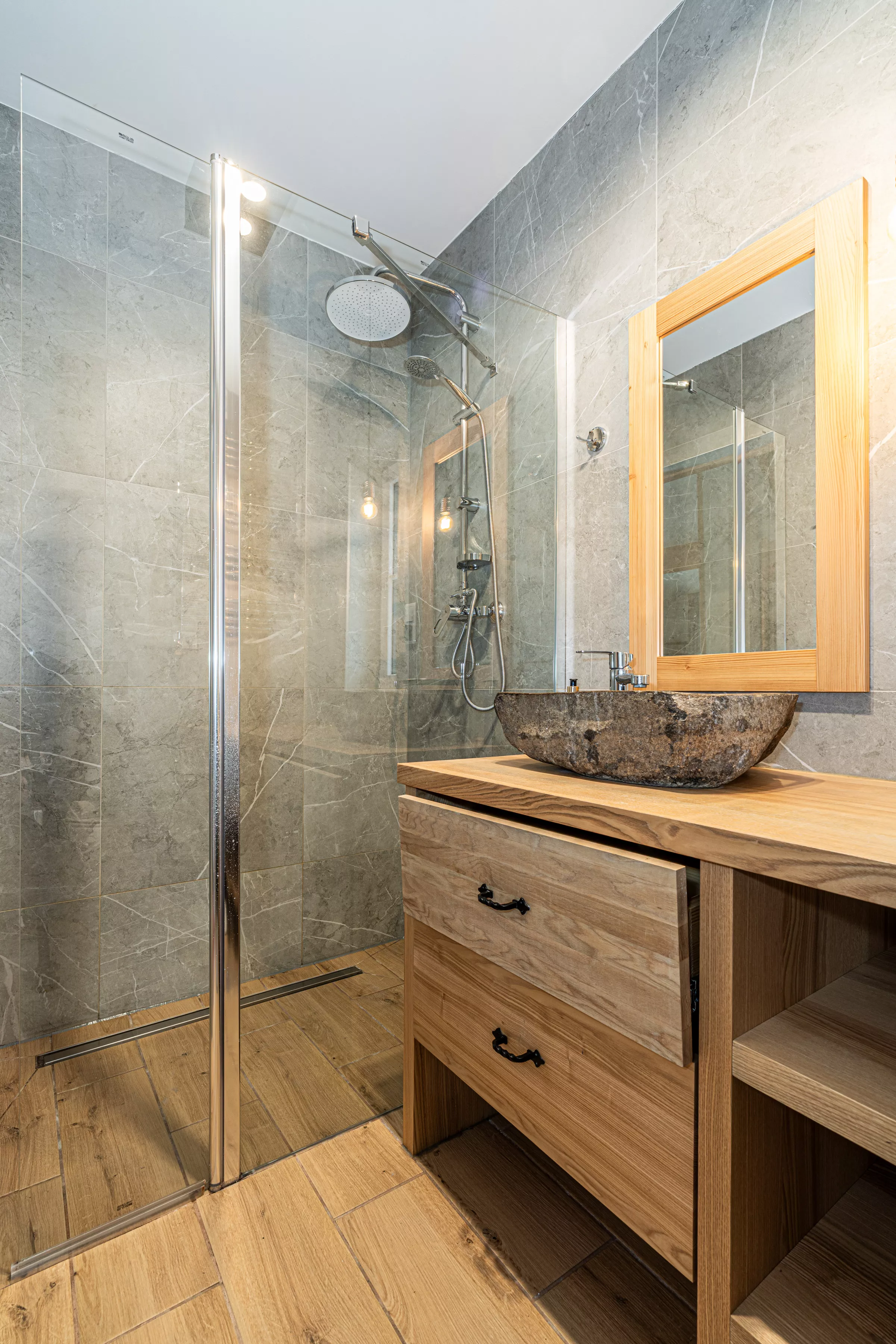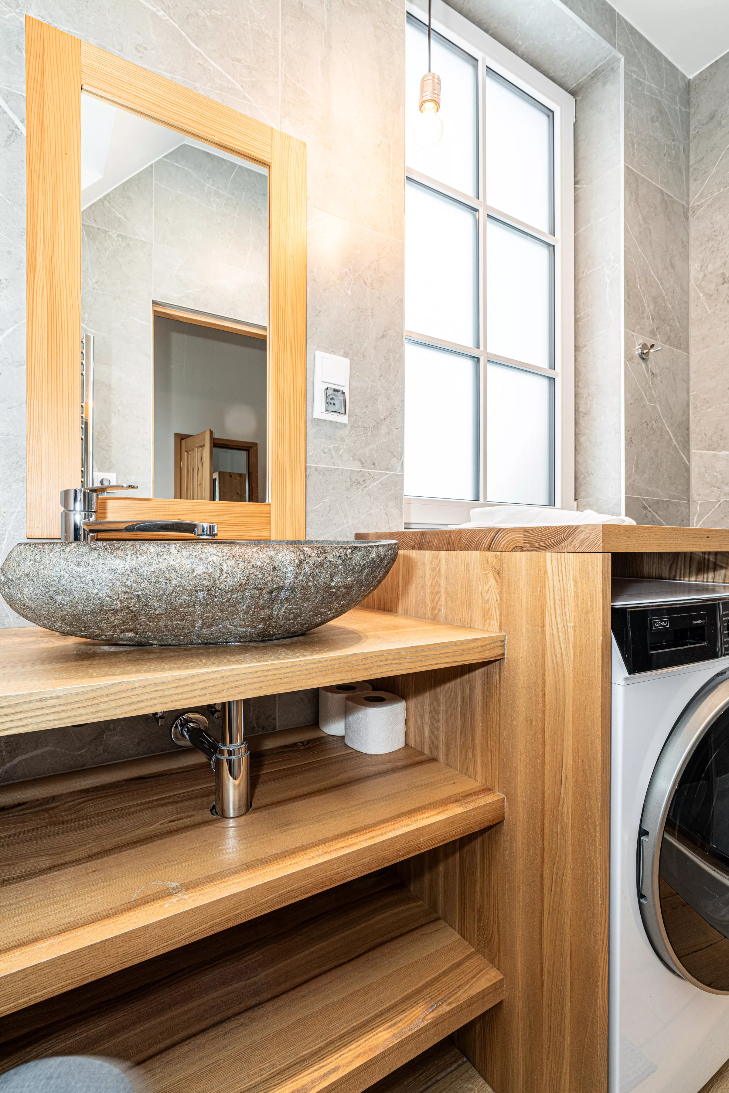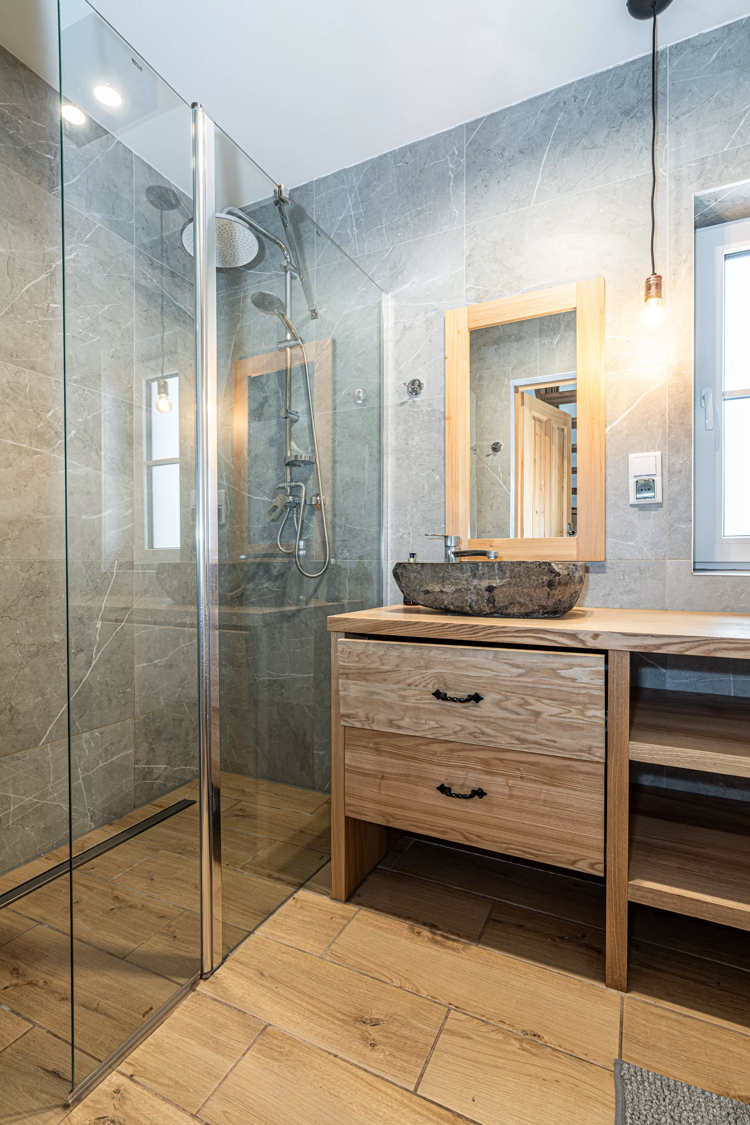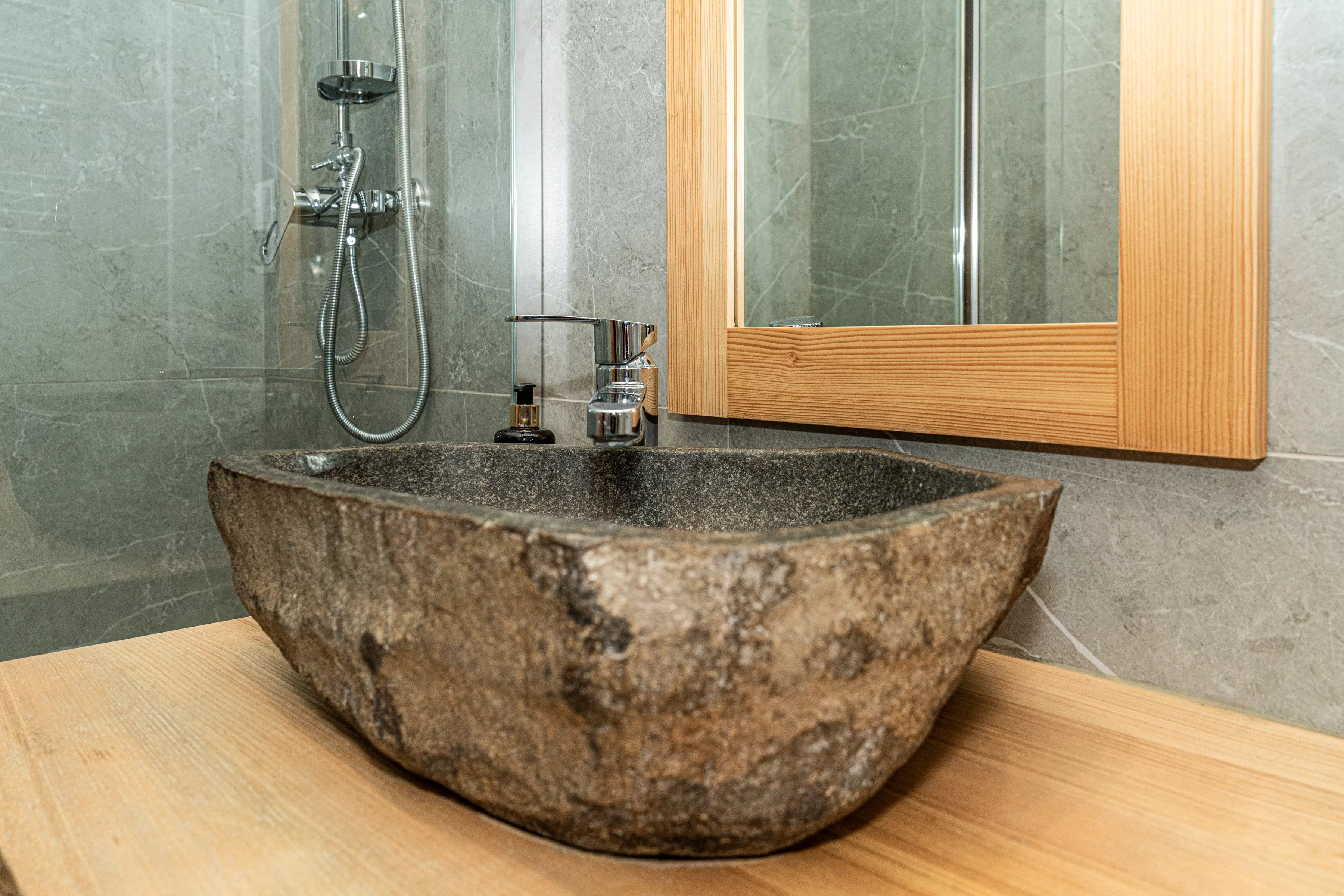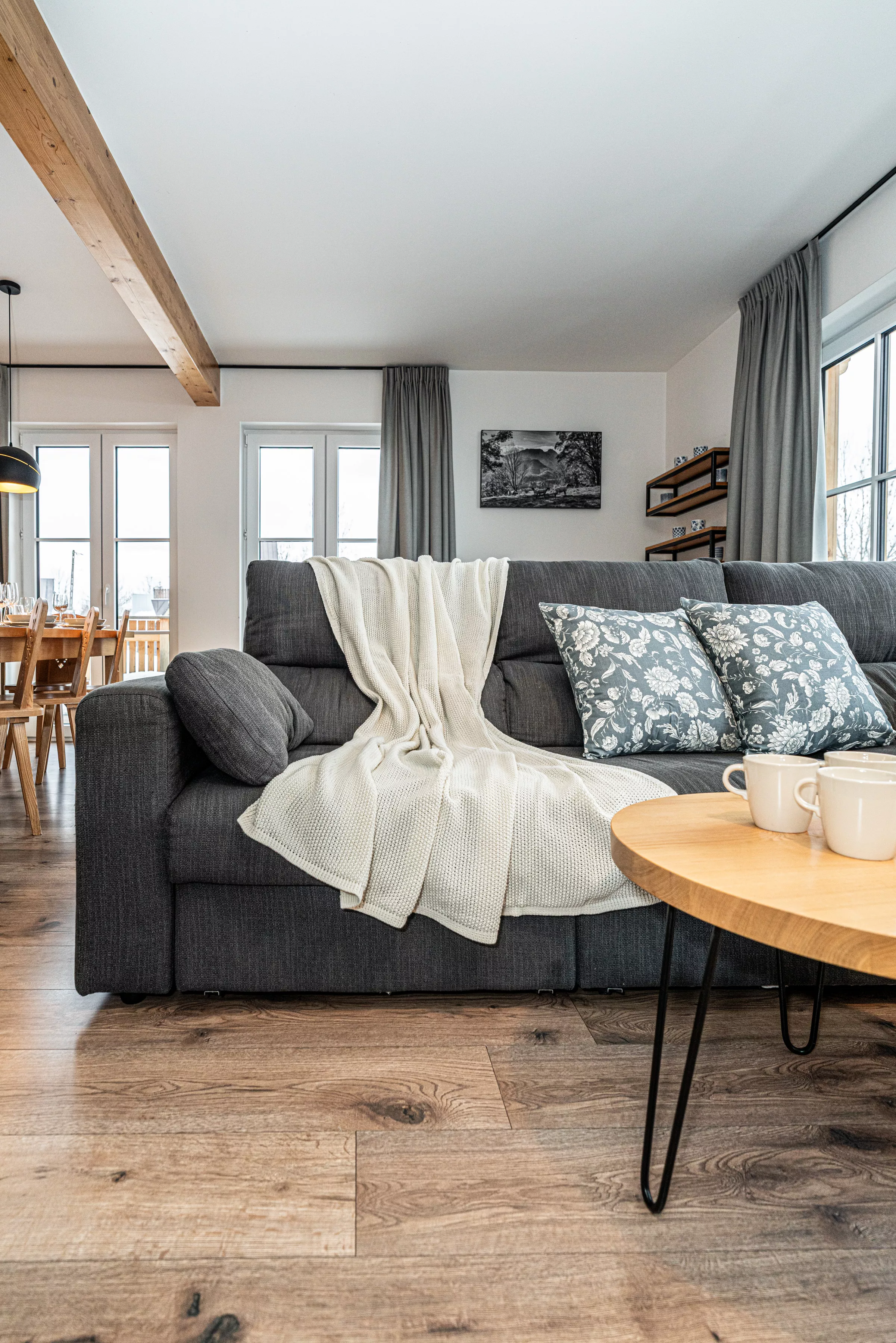 Wnętrze domku łączy nowoczesne rozwiązania z przytulnym, górskim stylem. Naturalne drewno i kamień nadają mu ciepły charakter, a kominek w salonie tworzy wyjątkową atmosferę sprzyjającą relaksowi po dniu pełnym wrażeń. Komfortowa strefa wypoczynkowa zachęca do wspólnego spędzania czasu, rozmów, czytania lub odpoczynku przy ogniu.