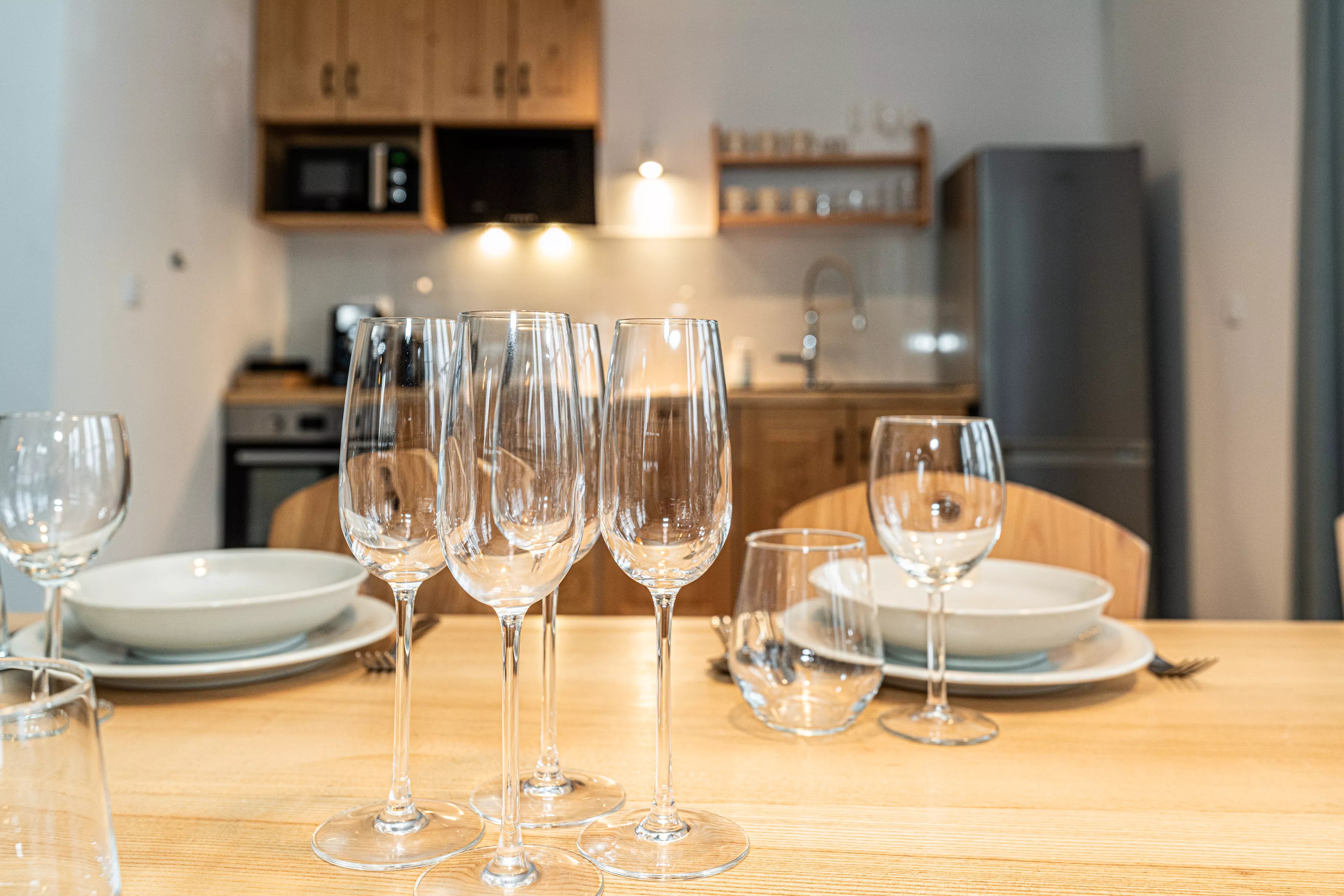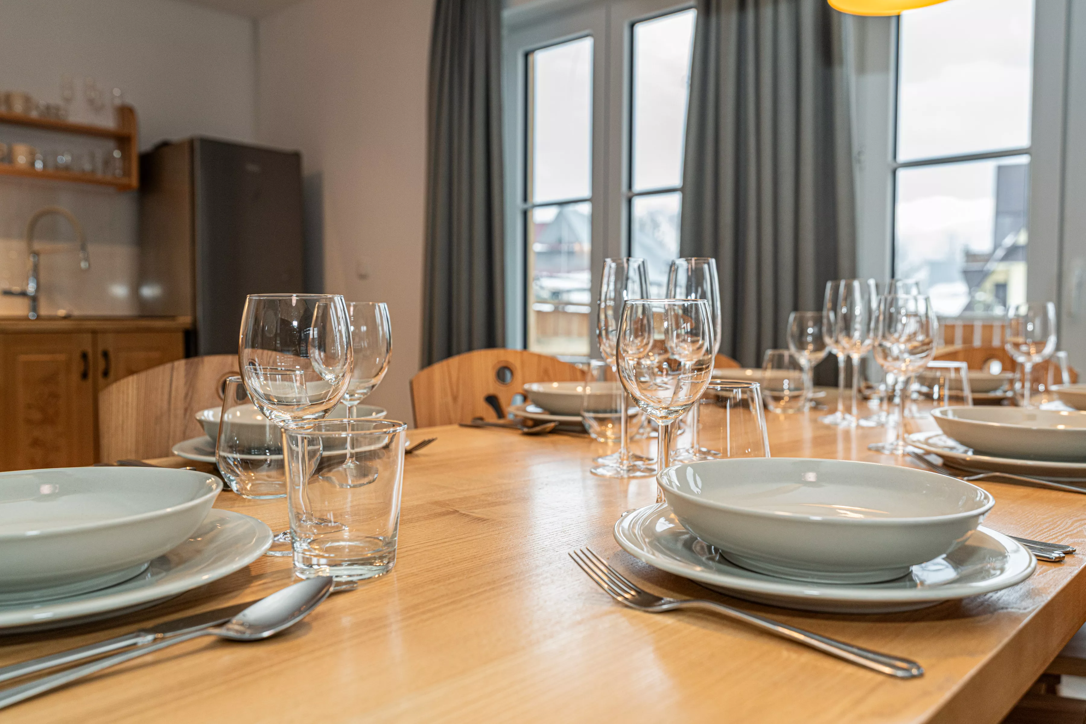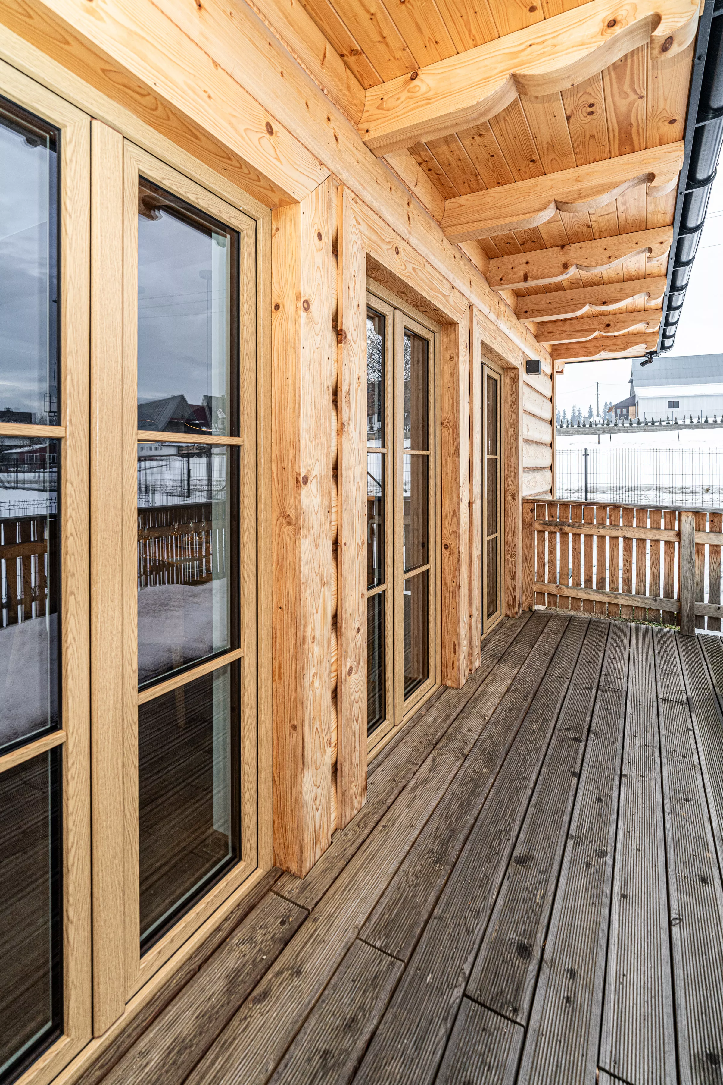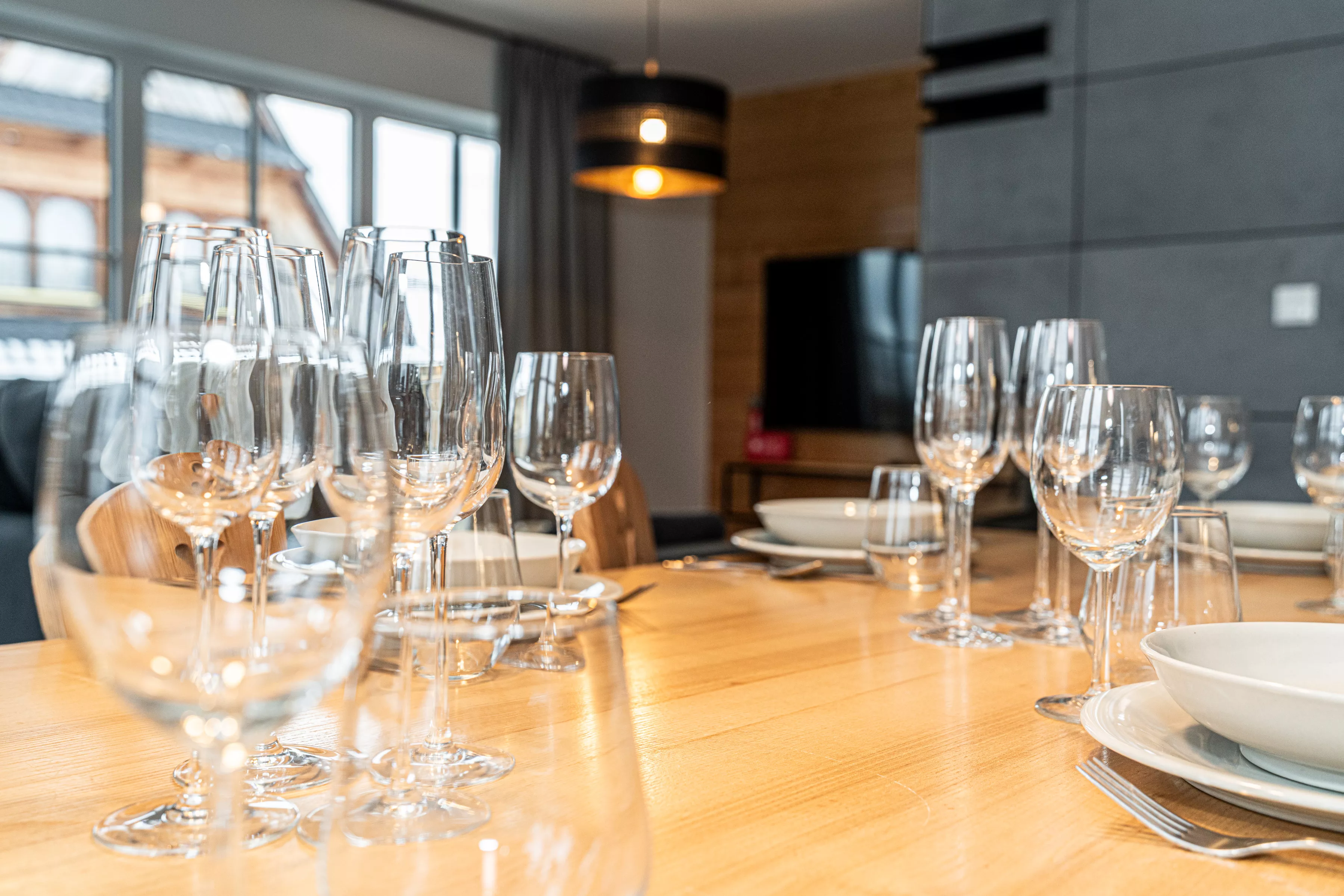 Przestronne przeszklenia doświetlają wnętrze naturalnym światłem i pozwalają podziwiać otoczenie, dając poczucie bliskości przyrody. Bezpośrednie wyjście na taras stwarza idealne warunki do porannej kawy, spokojnych posiłków lub wieczornego relaksu przy zachodzie słońca. Kameralne położenie domku zapewnia prywatność i ciszę – wartości szczególnie cenione podczas wypoczynku.